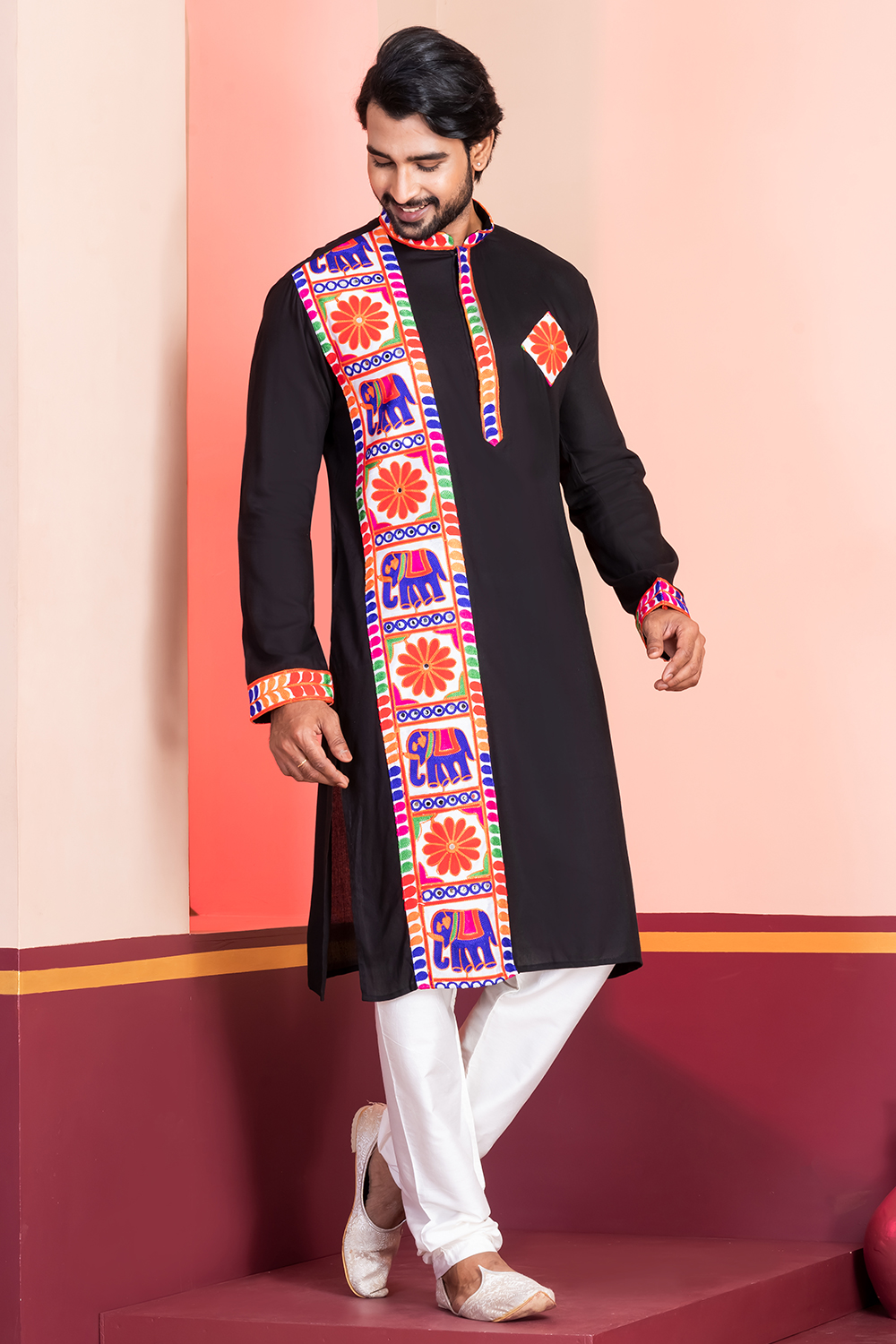 Black Rayon Embroidered Men's Kurta Churidar for Navratri
