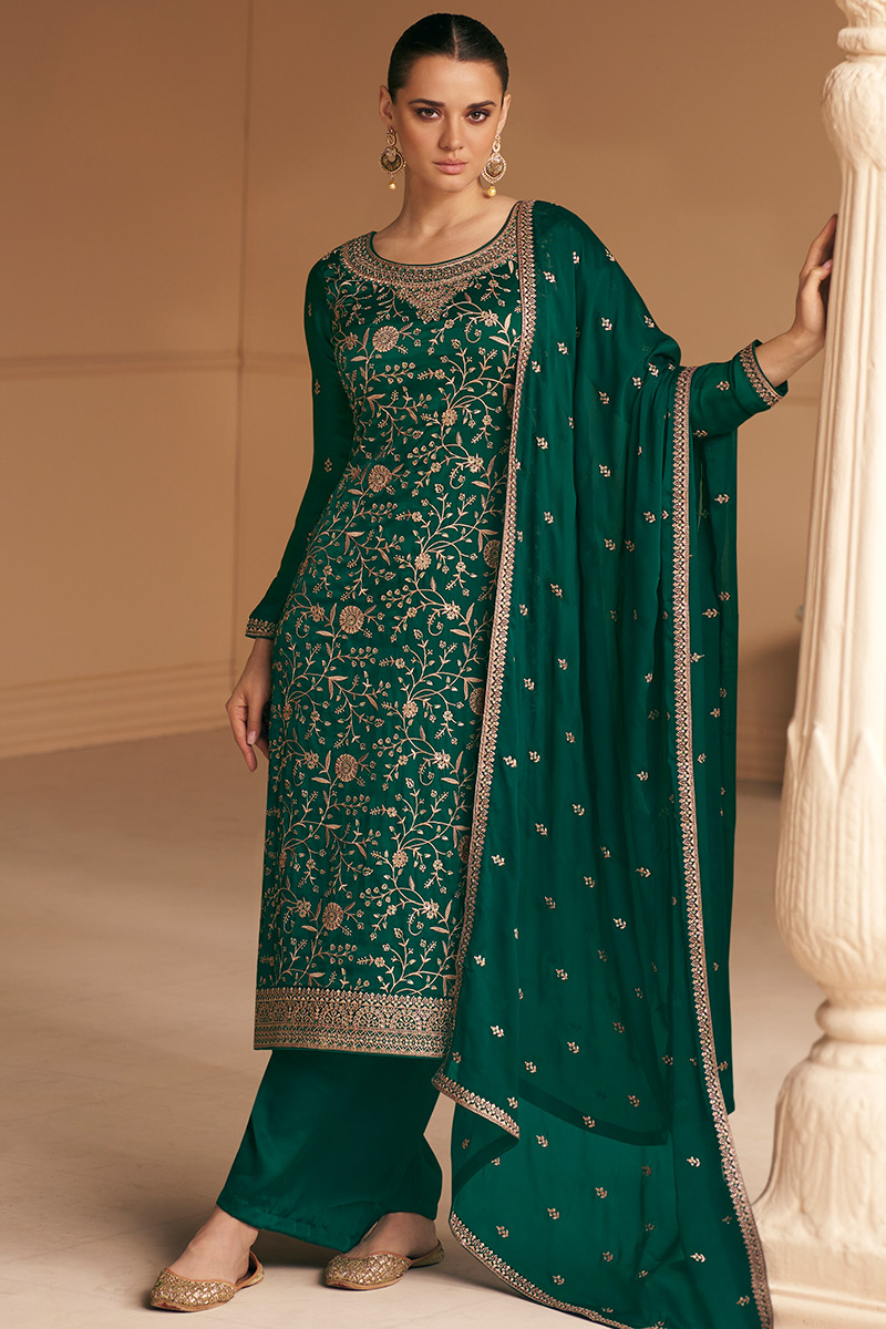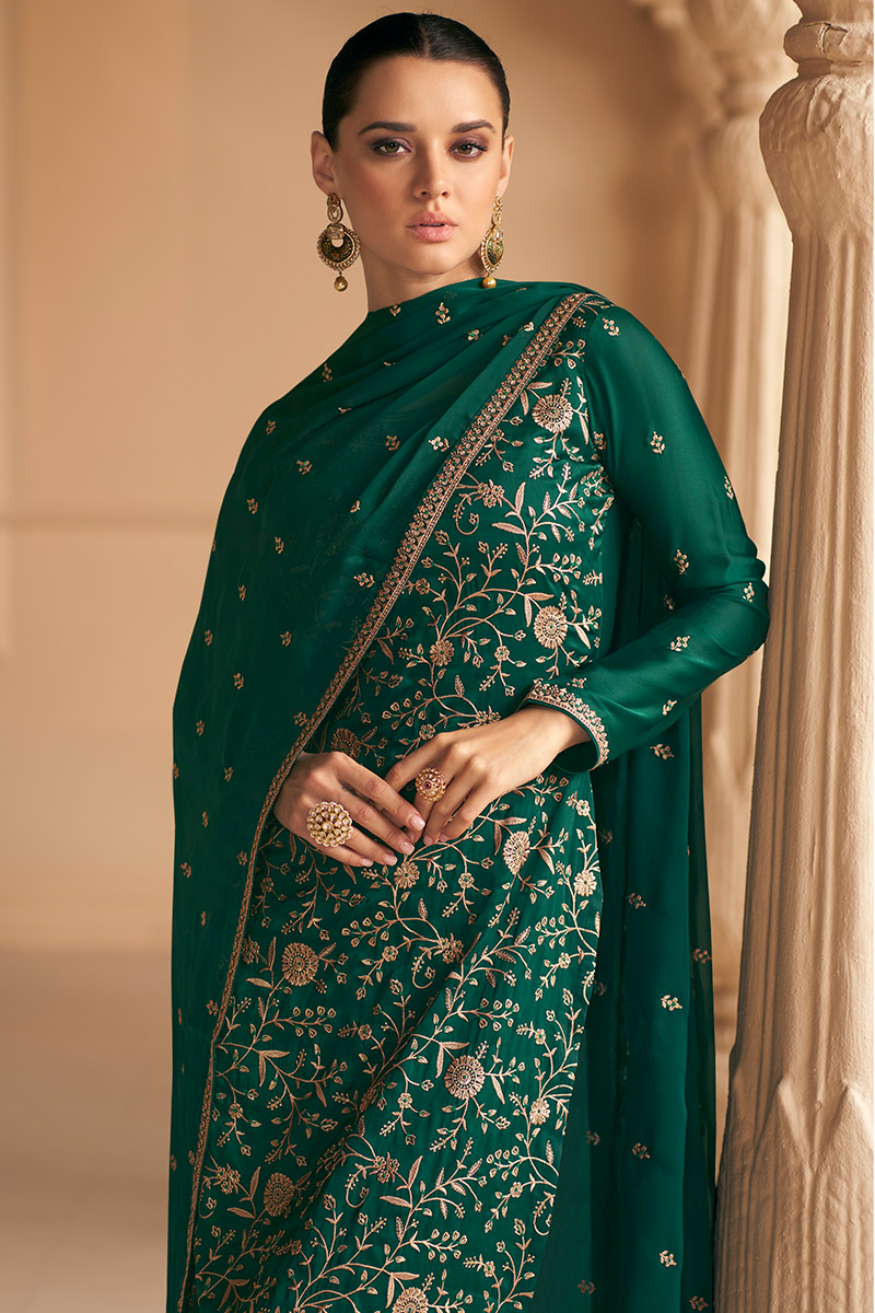 Bottle Green Georgette Embroidered Palazzo Salwar Suit for Mehndi