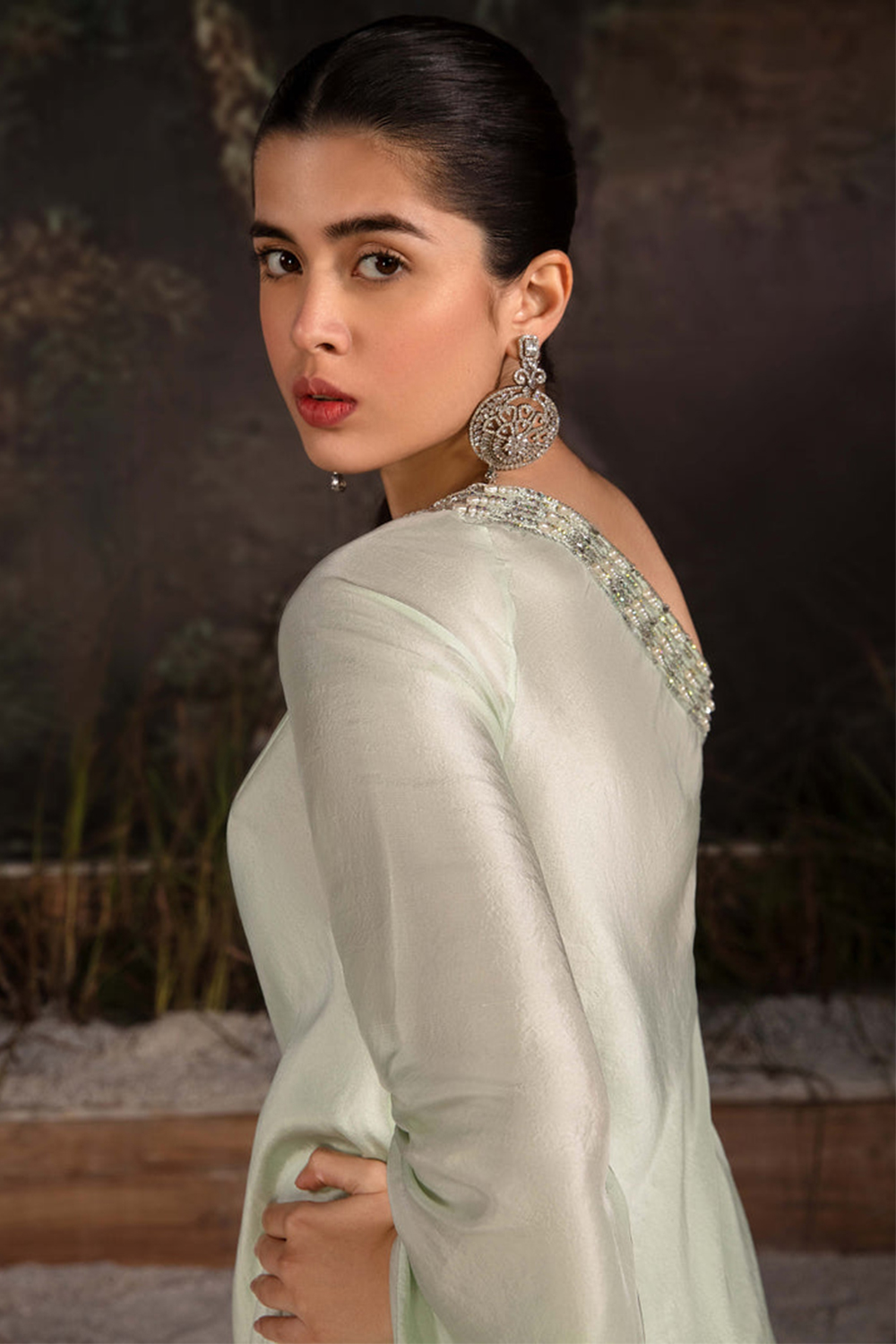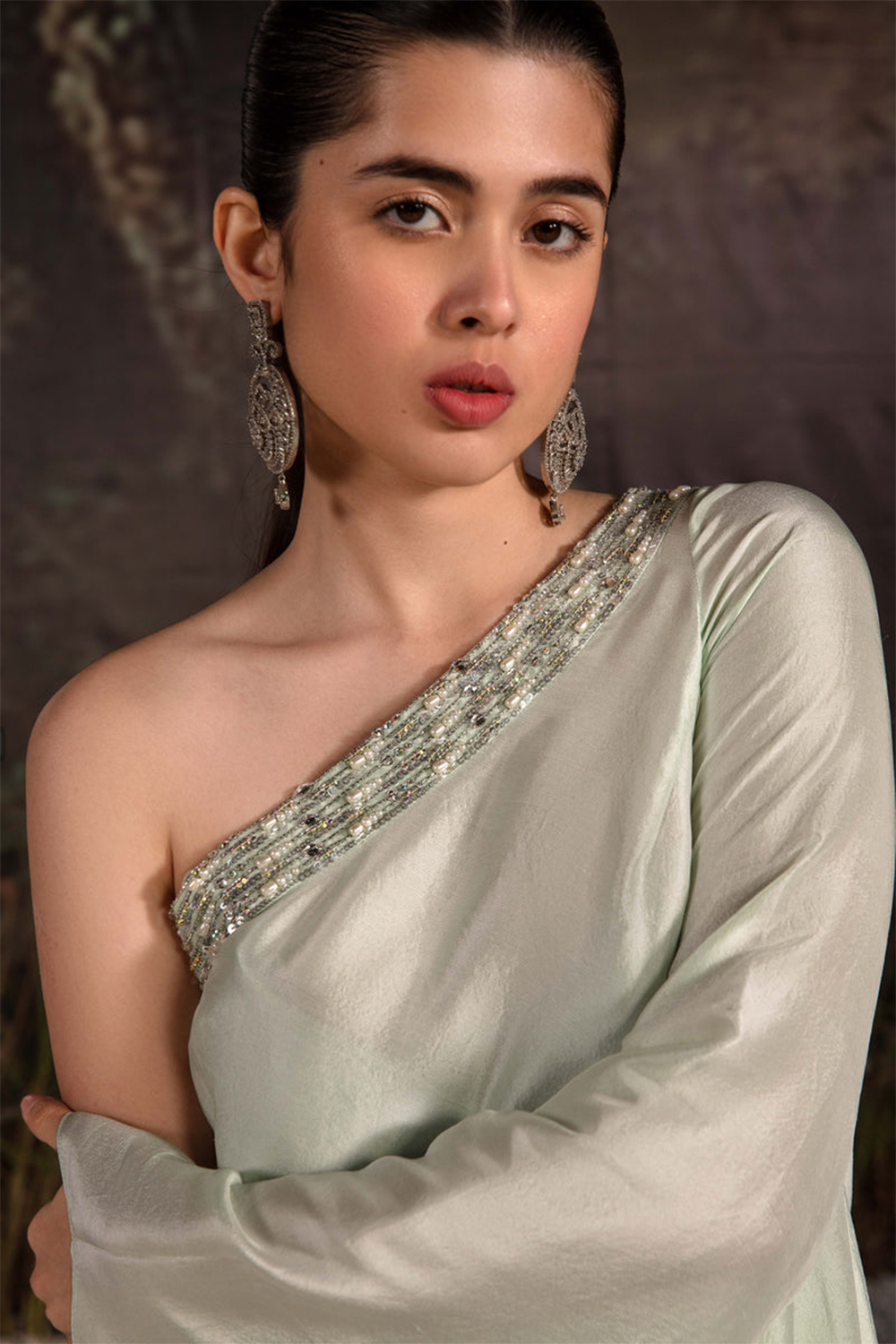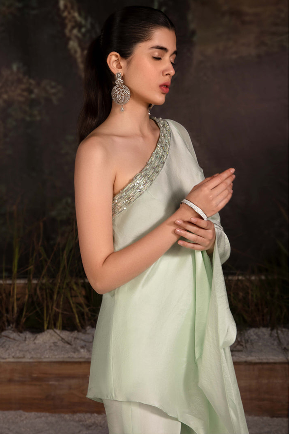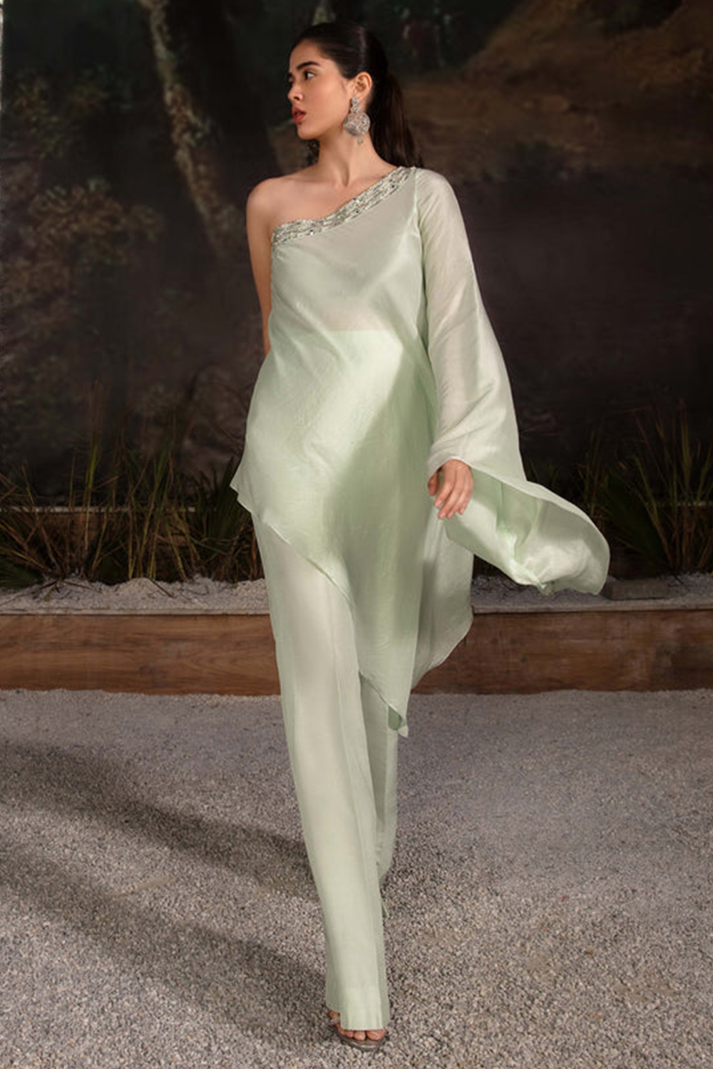 Make a refined statement with this elegant Mint Green Chiffon Trouser Suit, designed in a modern Indo-Western silhouette that radiates effortless glamour. The one-shoulder sleeve and asymmetrical neckline lend a chic and contemporary look.
