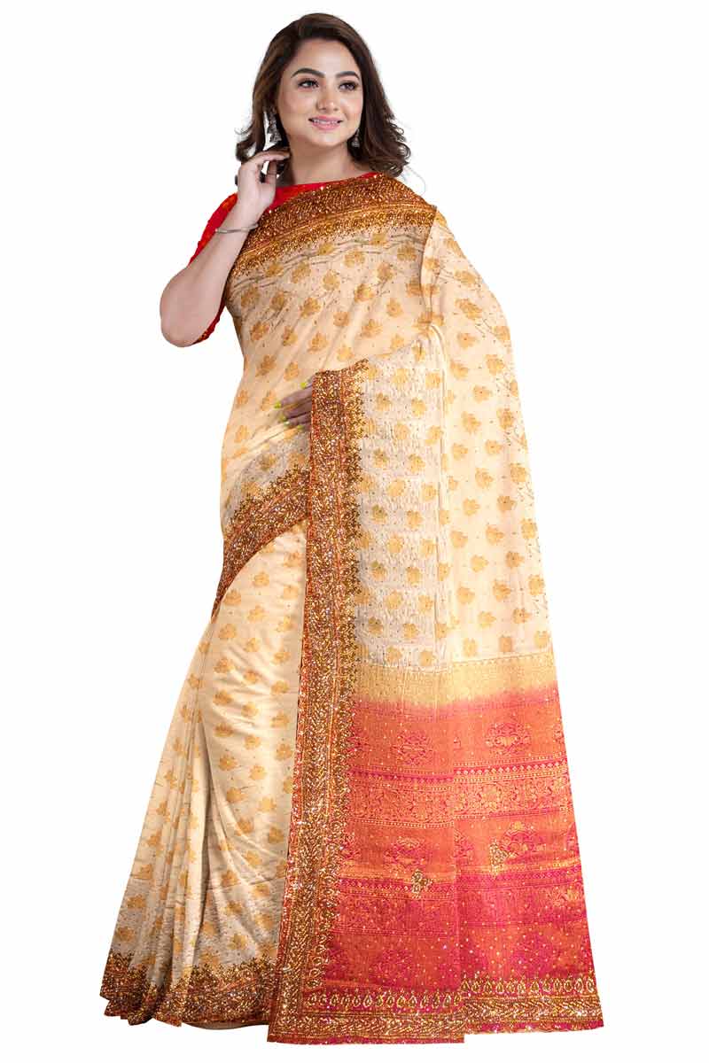 Cream Beige Silk Embroidered Party Wear Saree