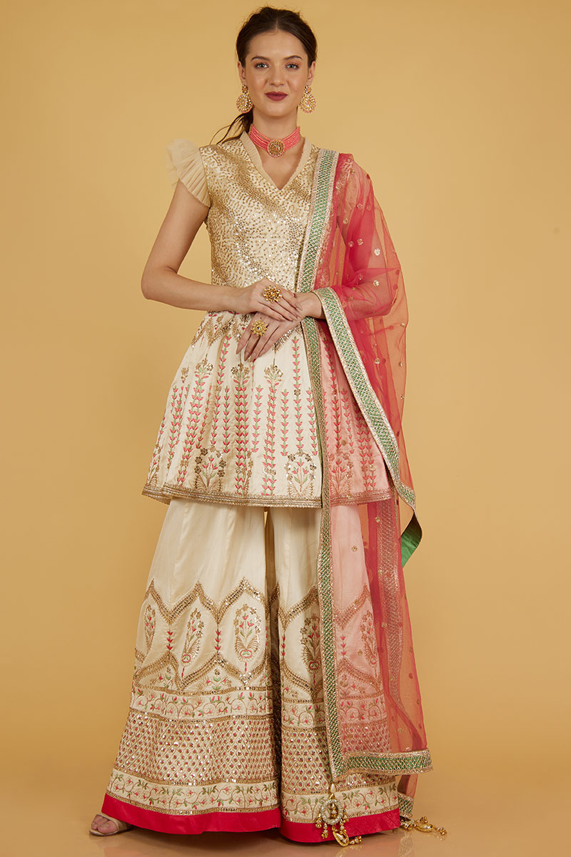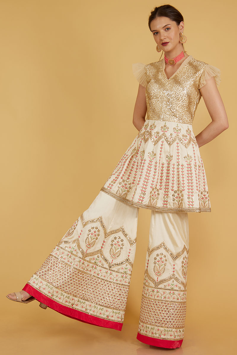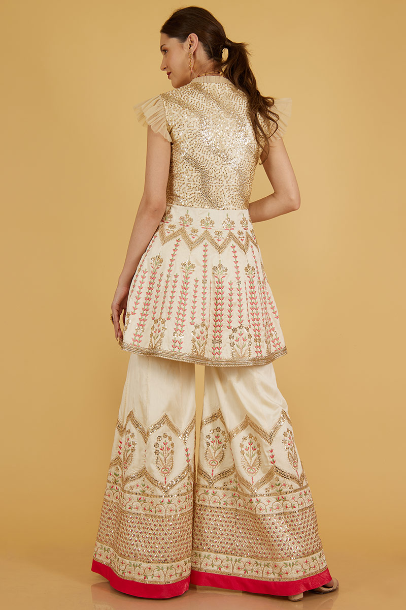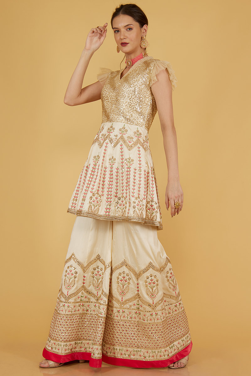 Look fabulous and beautiful by wearing this cream silk sharara suit which will certainly make you rule to the party.