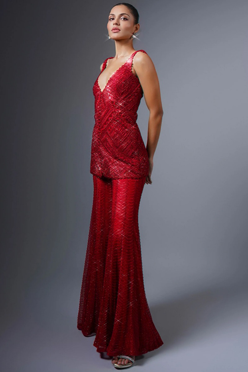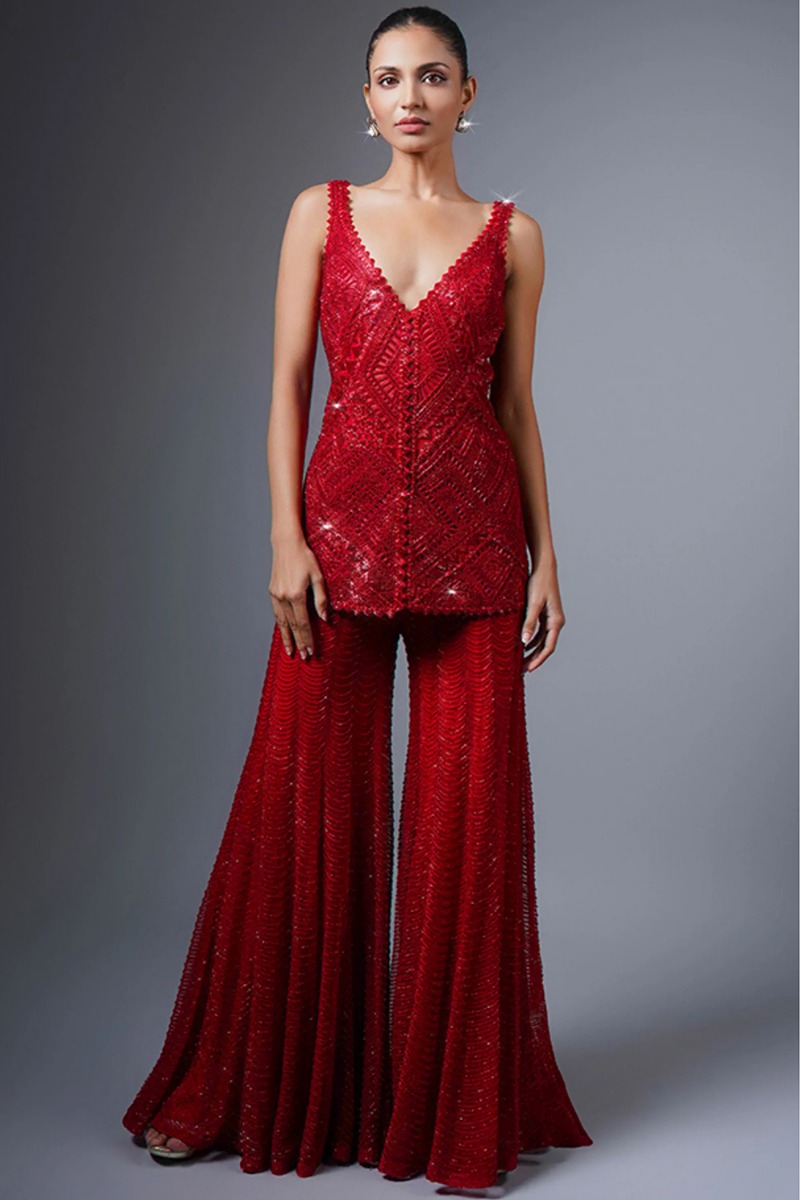 Perfectly cut, this deep red georgette sharara suit which surely sets you apart from the rest.