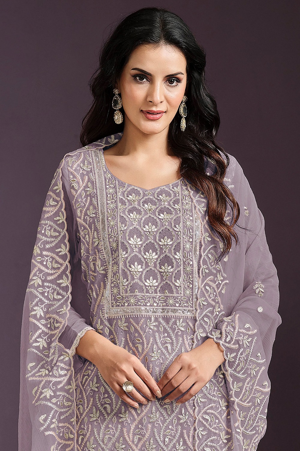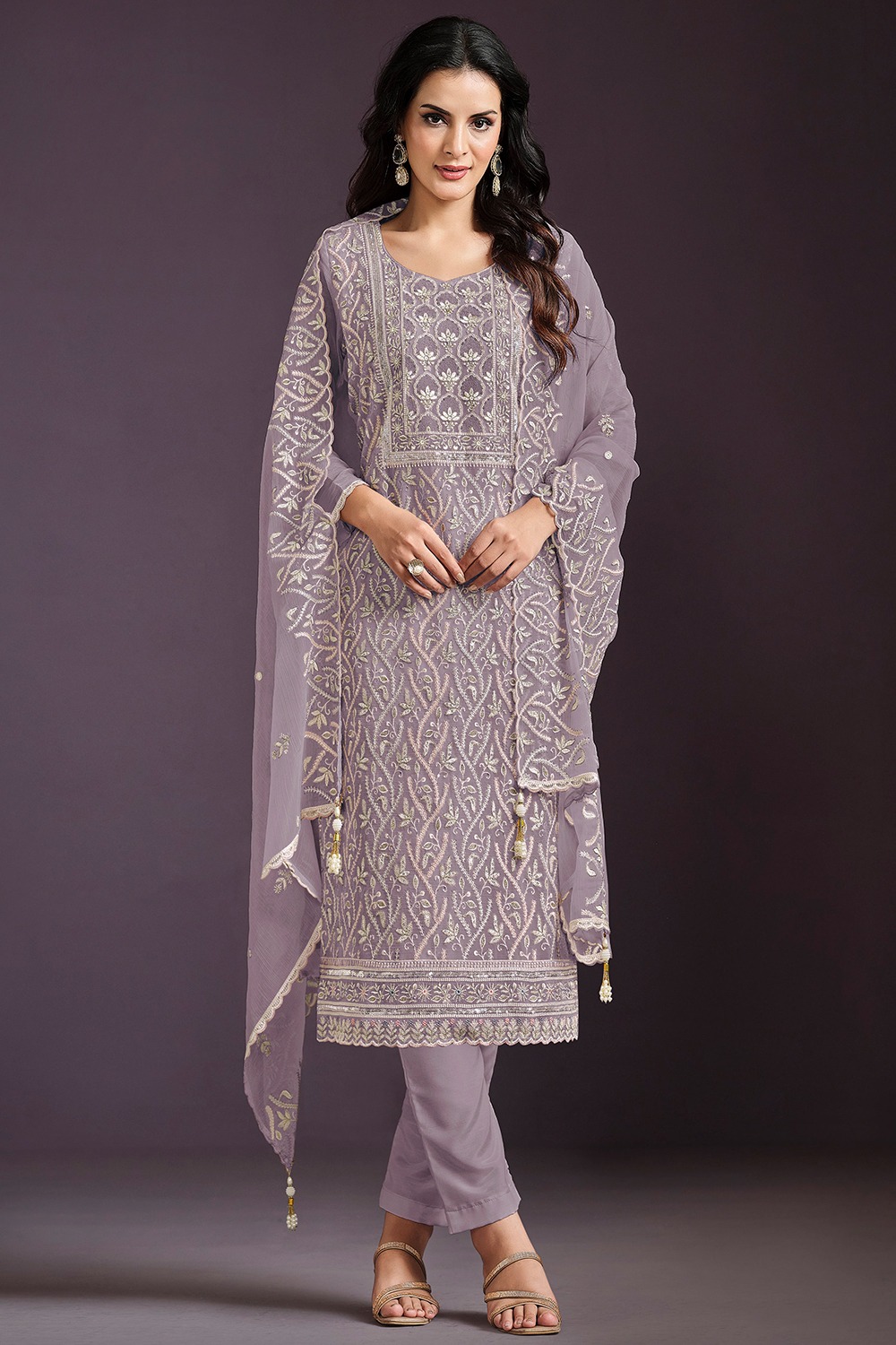 Enhance your ethnic charm by wearing this dusty mauve chinnon trouser suit which will make all the goddesses of love and beauty to write you for your advice.