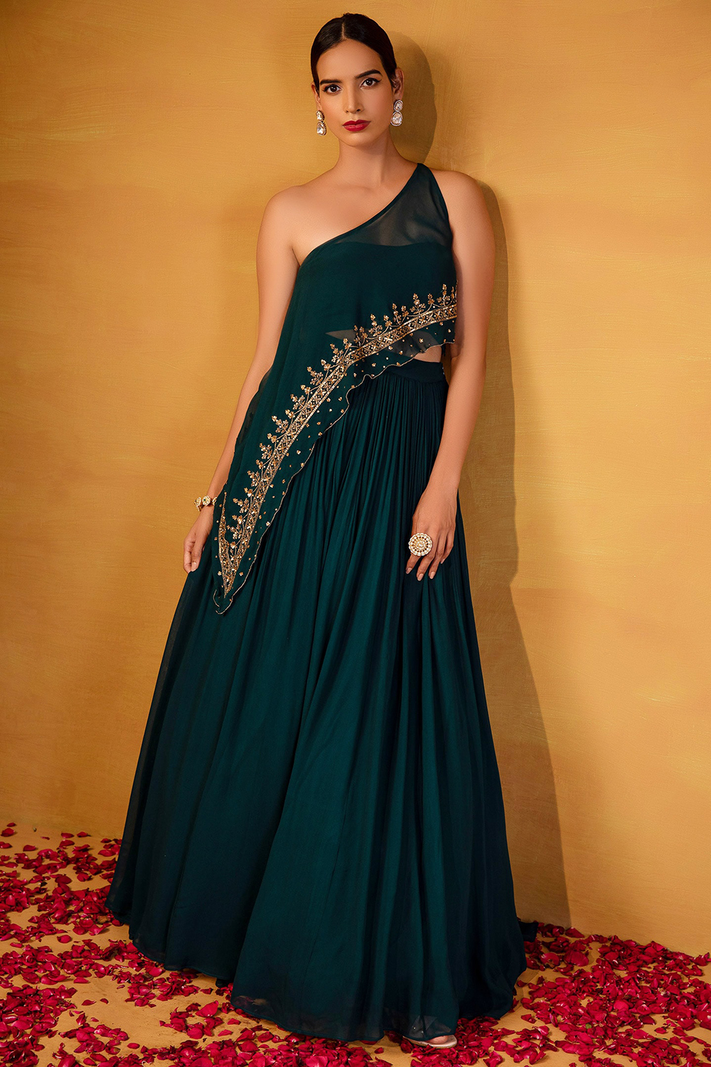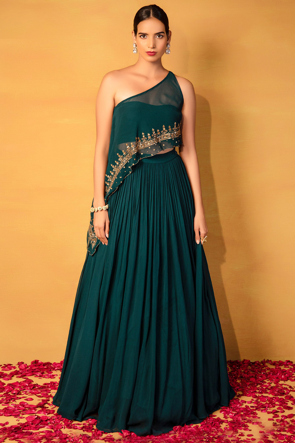 Emerald Green Embroidered Indo-Western Crepe Lehenga Set for Weddings