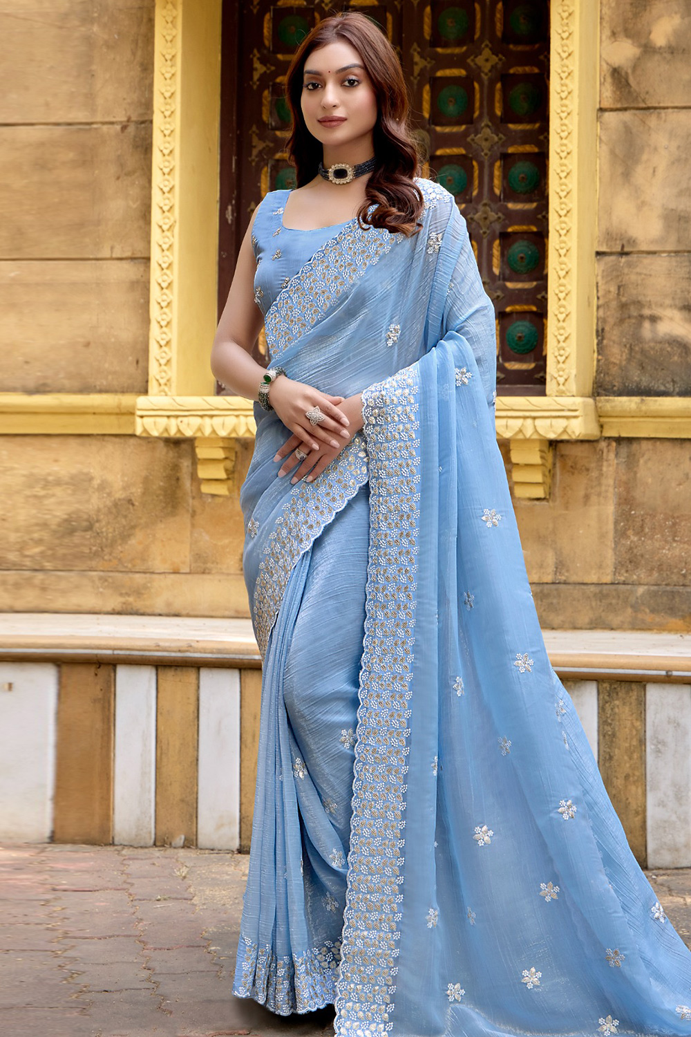 Exuding elegance and finished with perfection, this light blue chiffon saree which will give you absolute perfection.