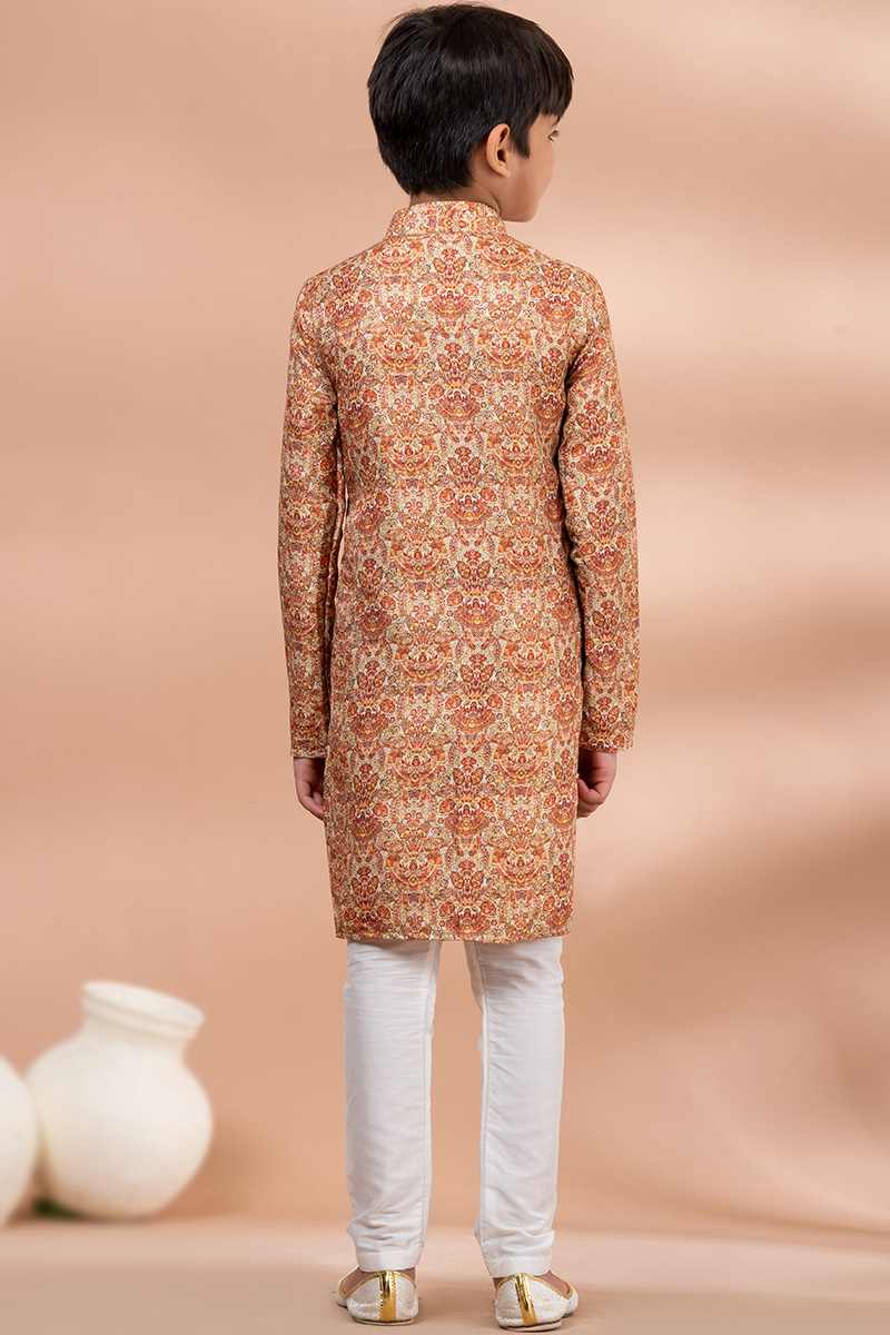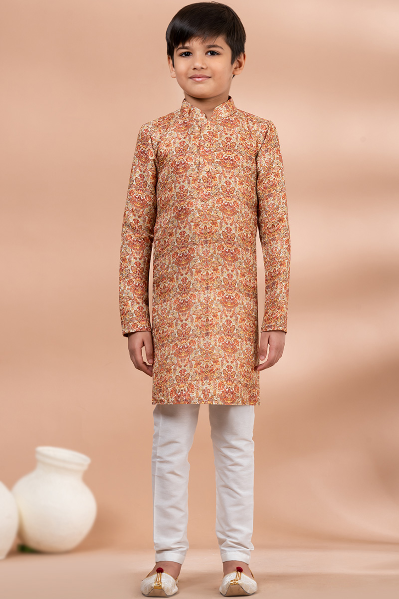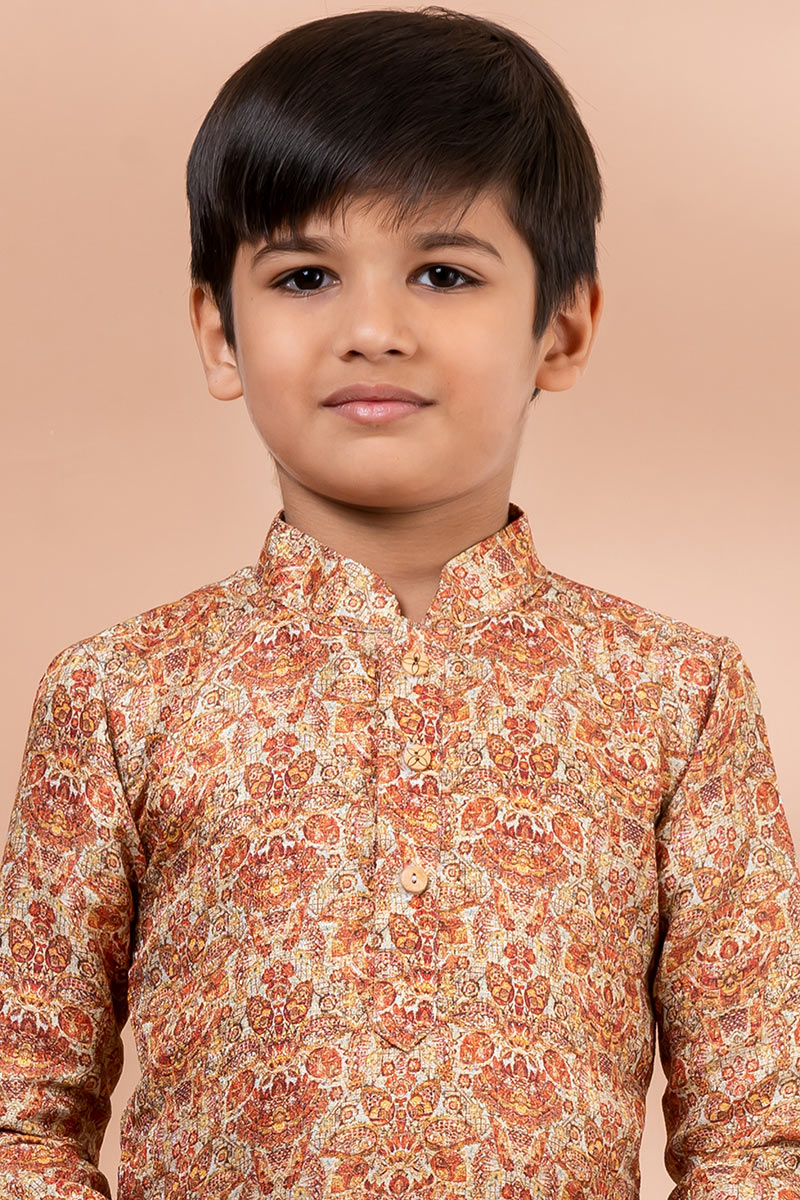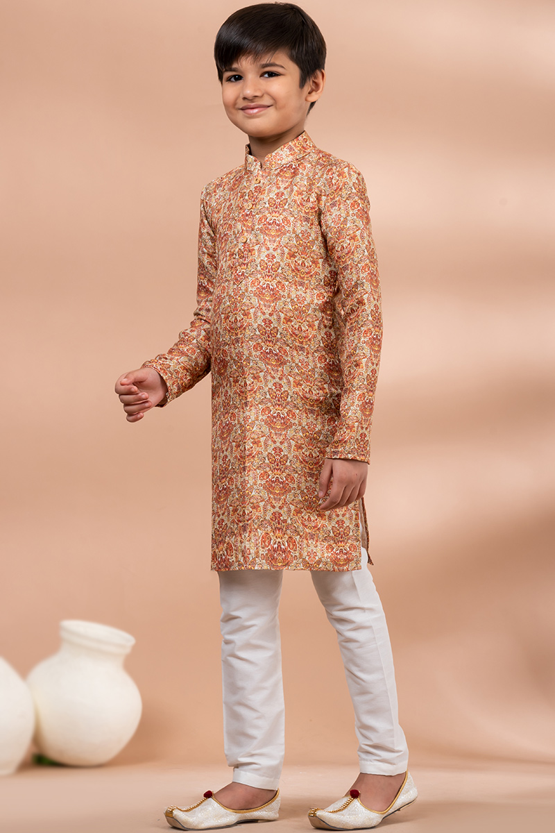 Light Brown Silk Printed Traditional Boy's Kurta Pajama