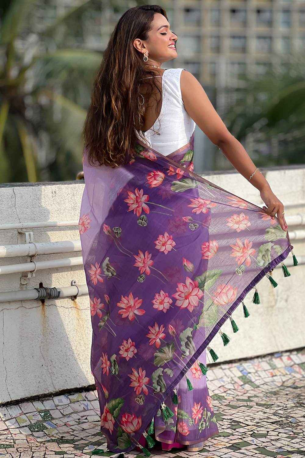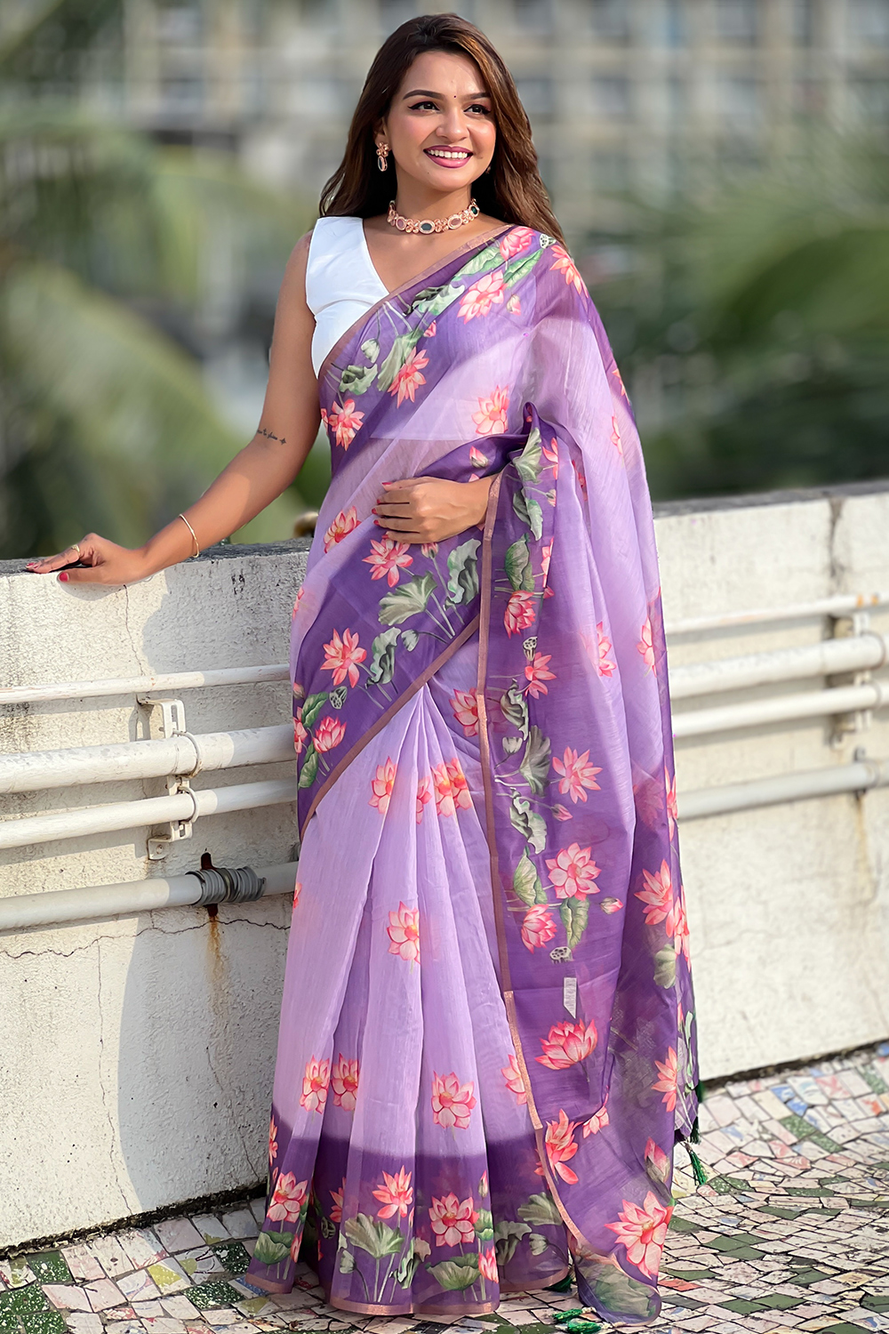It is present with chanderi cotton floral saree in light purple color foil print and floral print work.