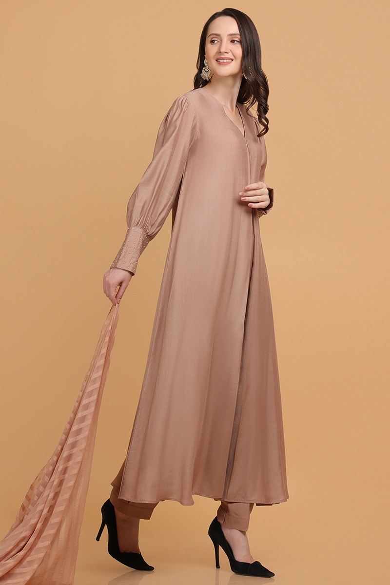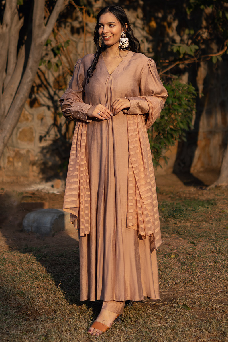 Let the next ethnic occasion see you flaunt a mesmerizingly vibrant avatar wearing this dusty peach linen trouser suit.