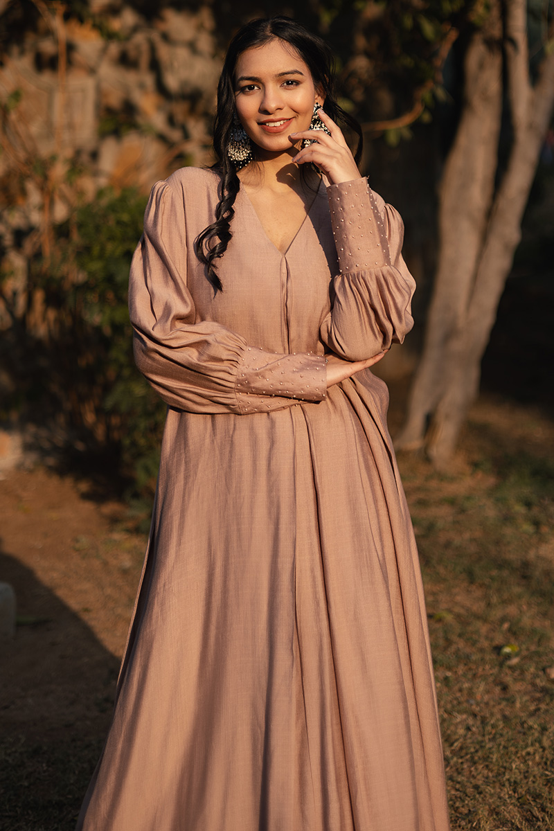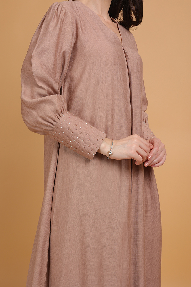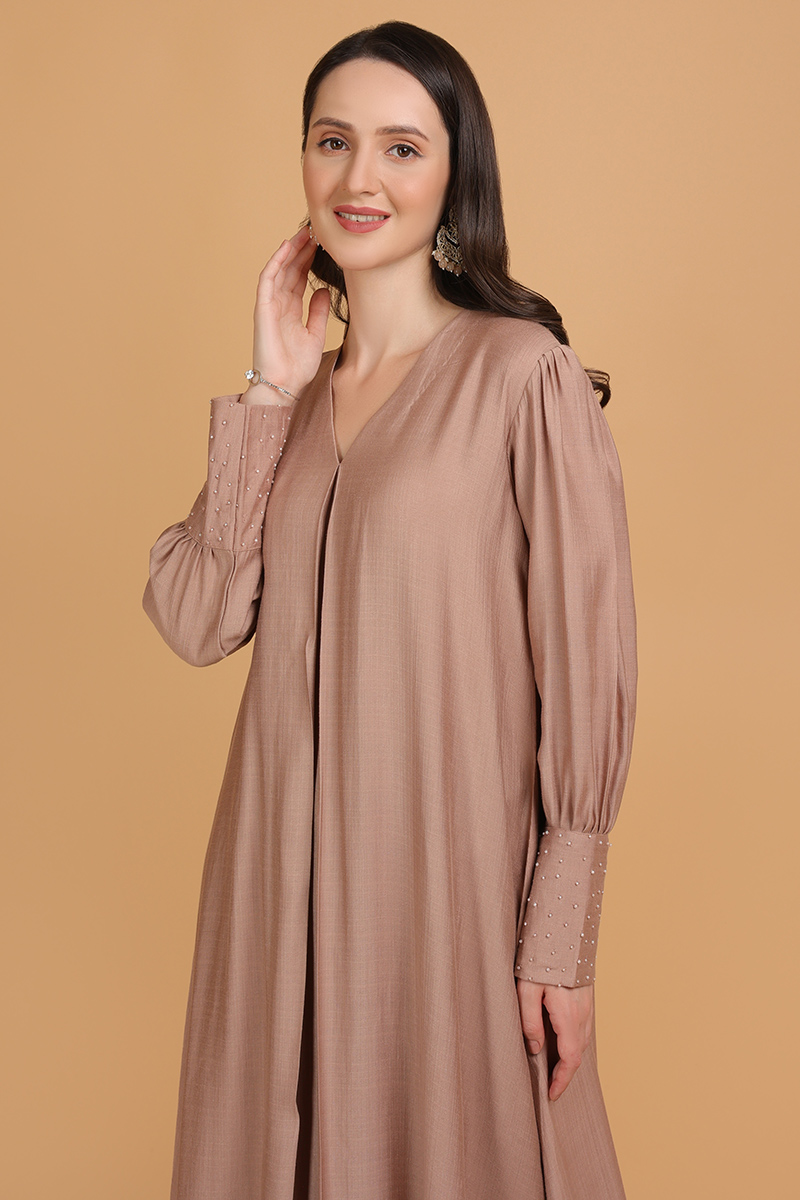 This v neck and full sleeve suit is designed with beads work at the sleeves.