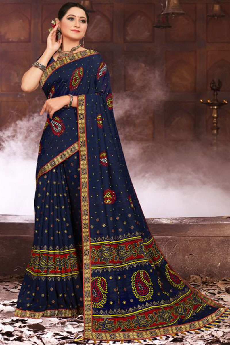 Pull together a chic look when you wear this navy blue silk saree that exudes feminine charm.