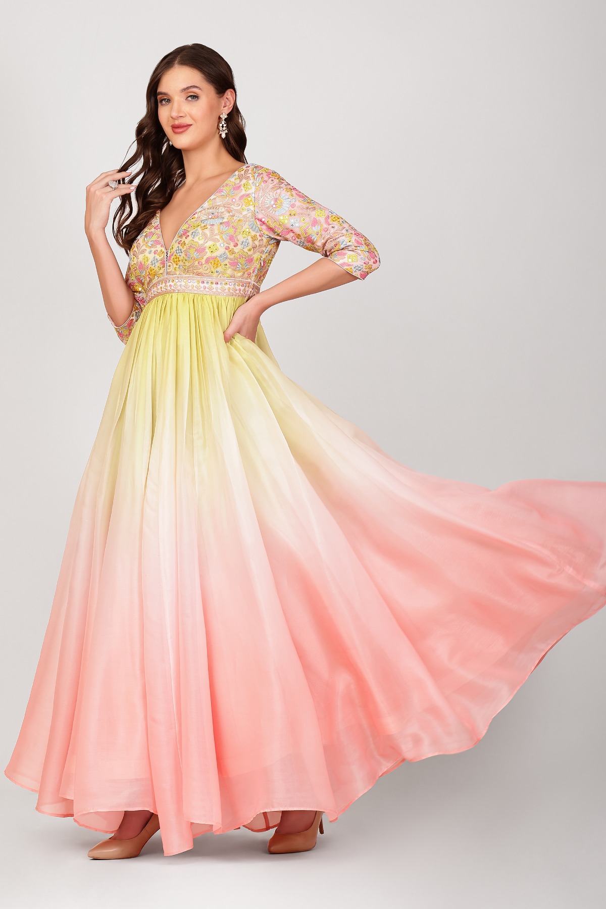 Noor-e-Bahar Organza Designer Anarkali Set from citrus yellow to blush pink ombre