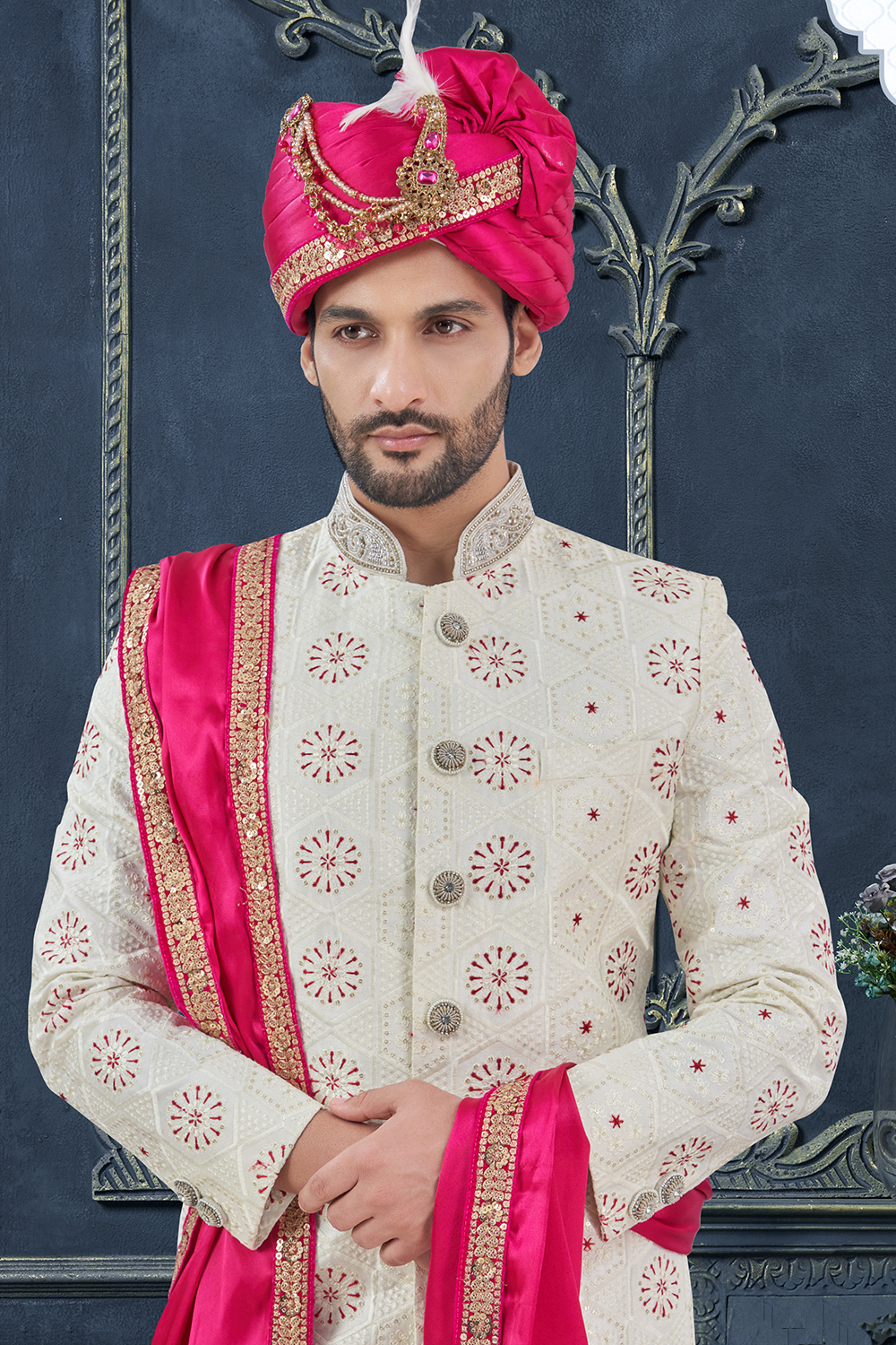 Elevate your style for any festive gathering with this striking off white men's sherwani ensemble. Crafted from silk blend fabric, it boasts intricate resham thread, beads, pearl, zari, stone, and sequins work. which enhances its timeless charm. The chinese collar and full sleeves offer a stylish touch, while the bottom is made of a silk blend fabric, which completes the look.