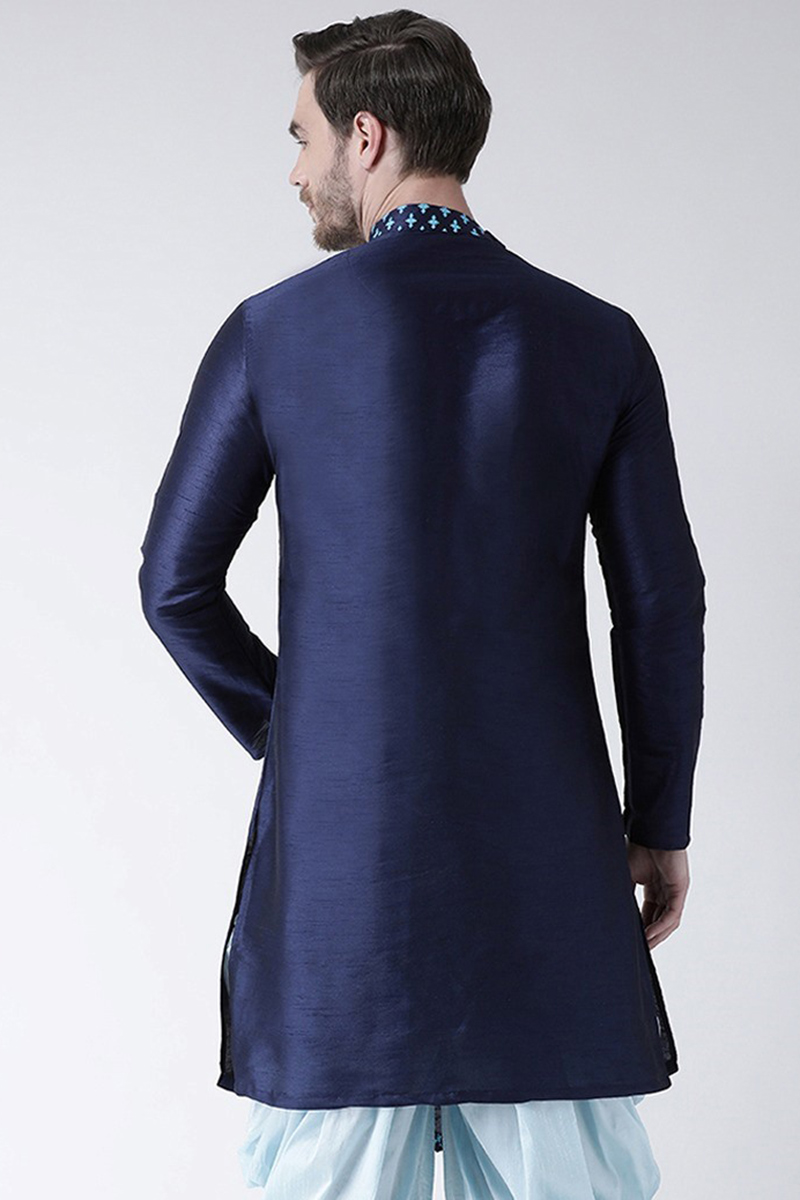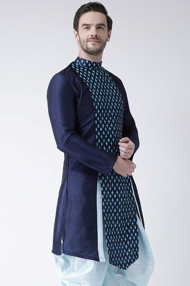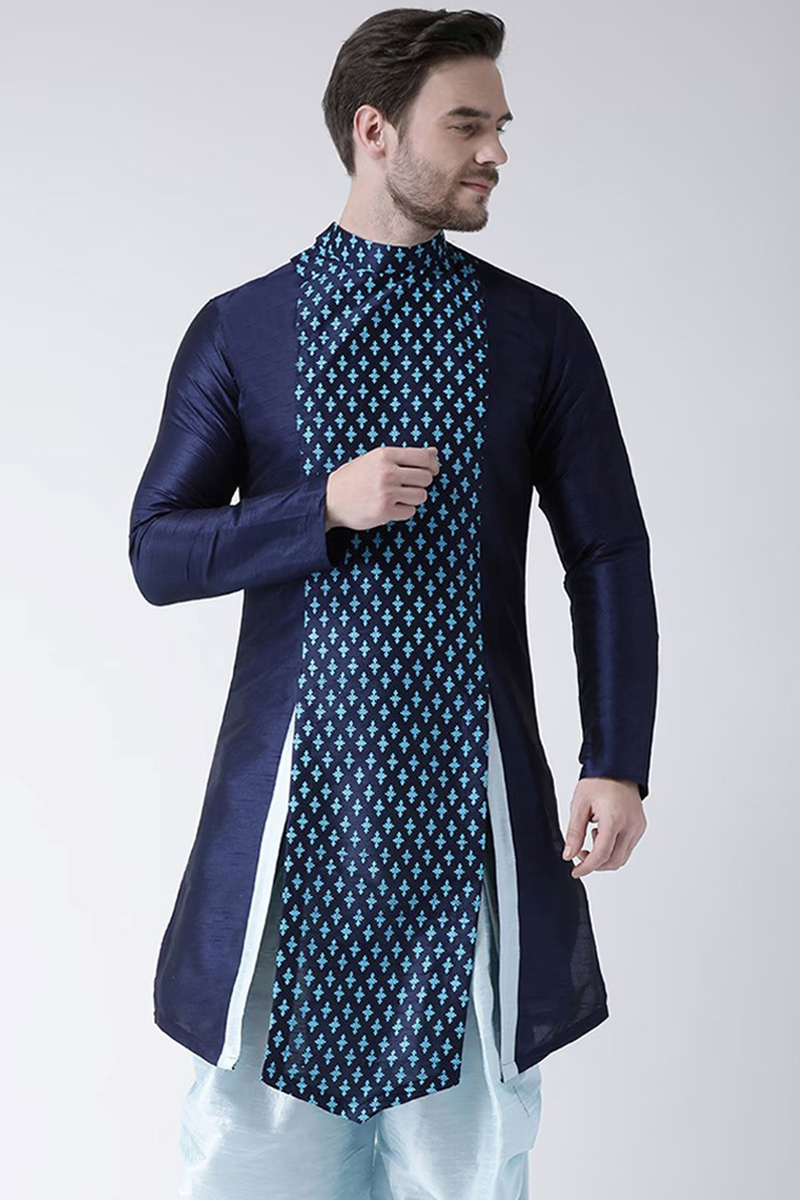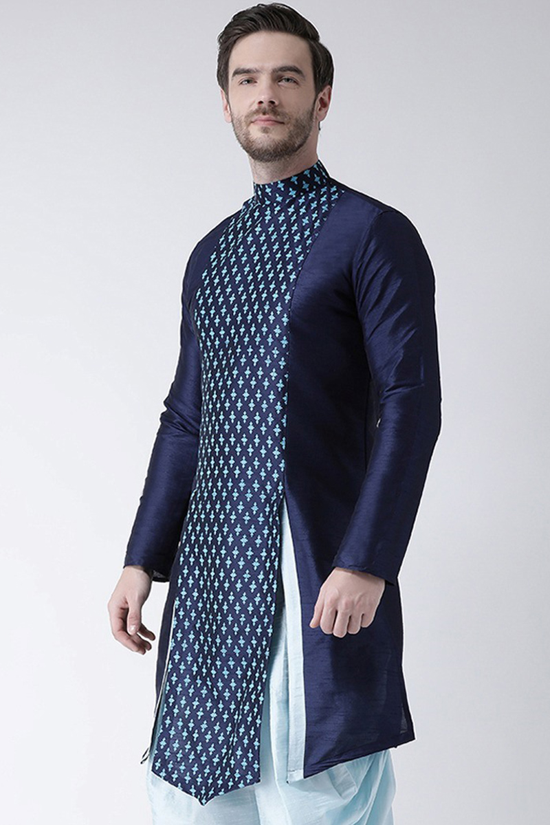 Printed Navy Blue Dupion Silk Side Slit Men's Kurta