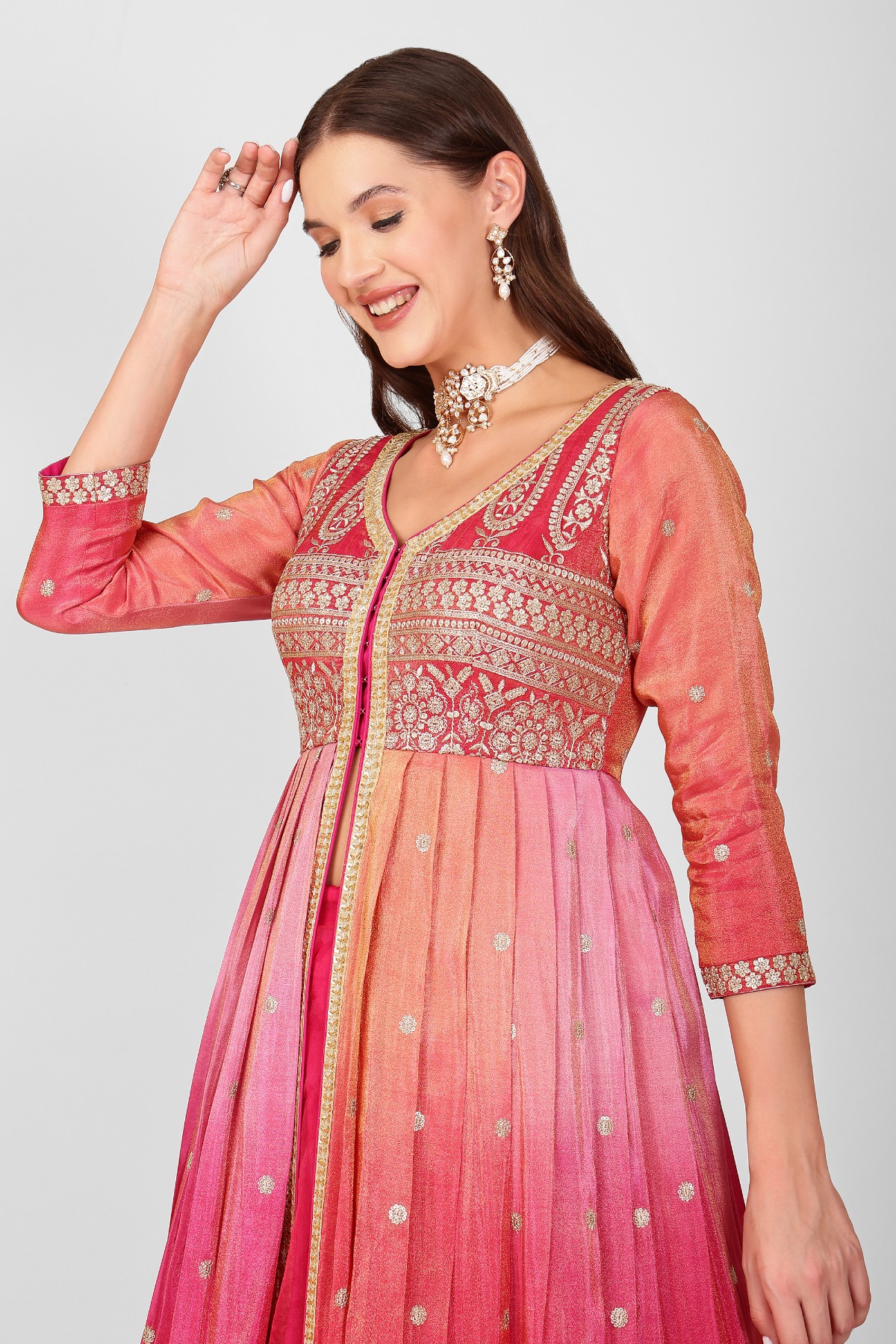 An ideal pick to garner compliments for your ravishing ethnic look is this rani pink organza anarkali suit which will be scene-stealing ethnic wear to shine in the spotlight.