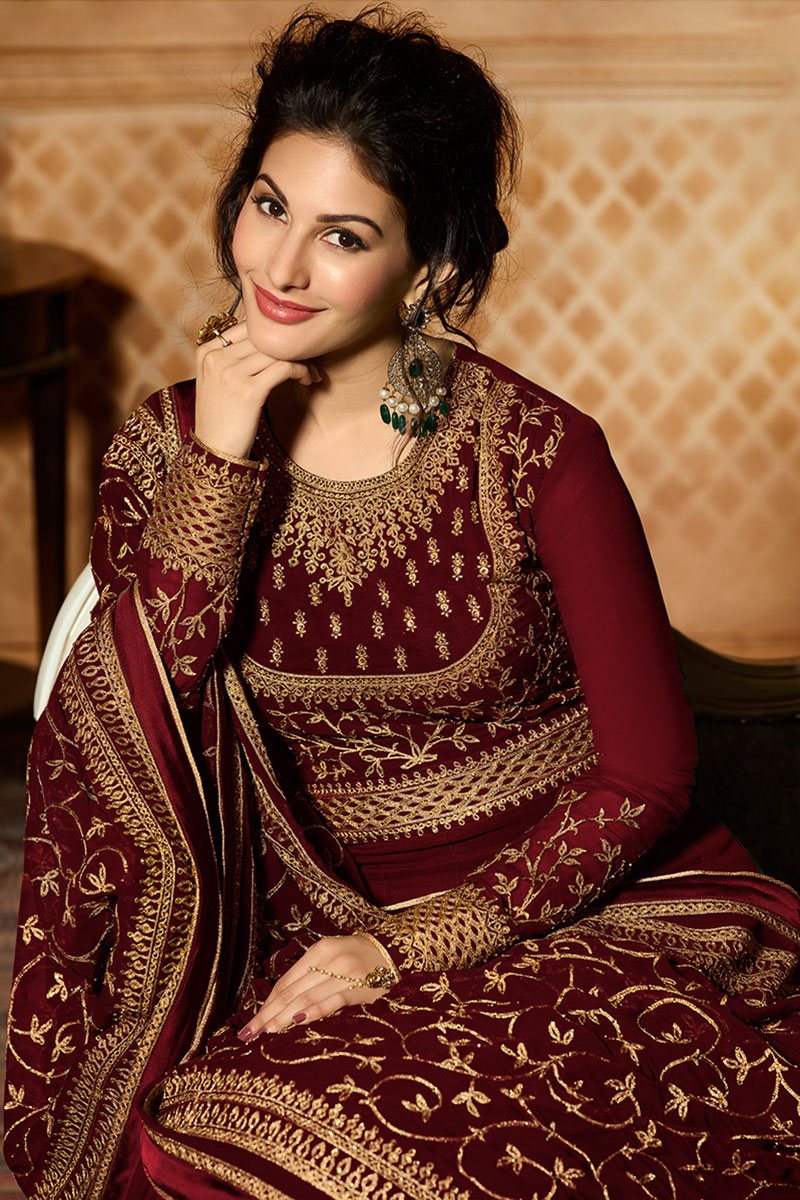 Resham Embroidered Georgette Burgundy Maroon Plus Size Anarkali Suit