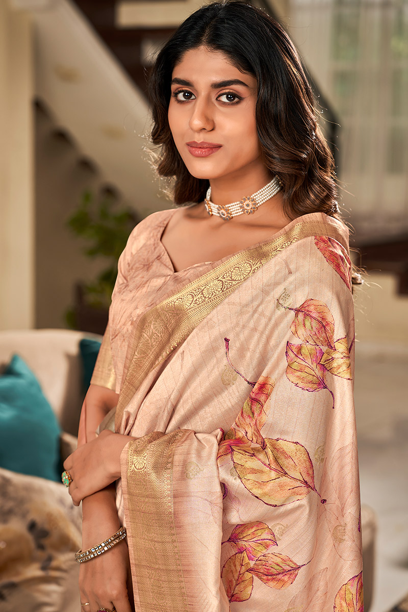 To complement your graceful demeanor, Andaaz Fashion presents this dusty peach silk saree which exudes feminine charm.