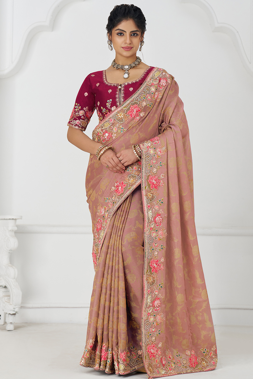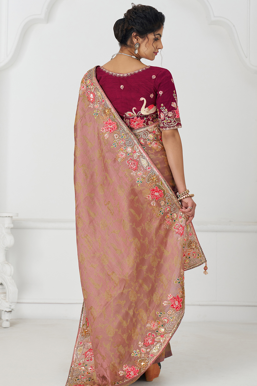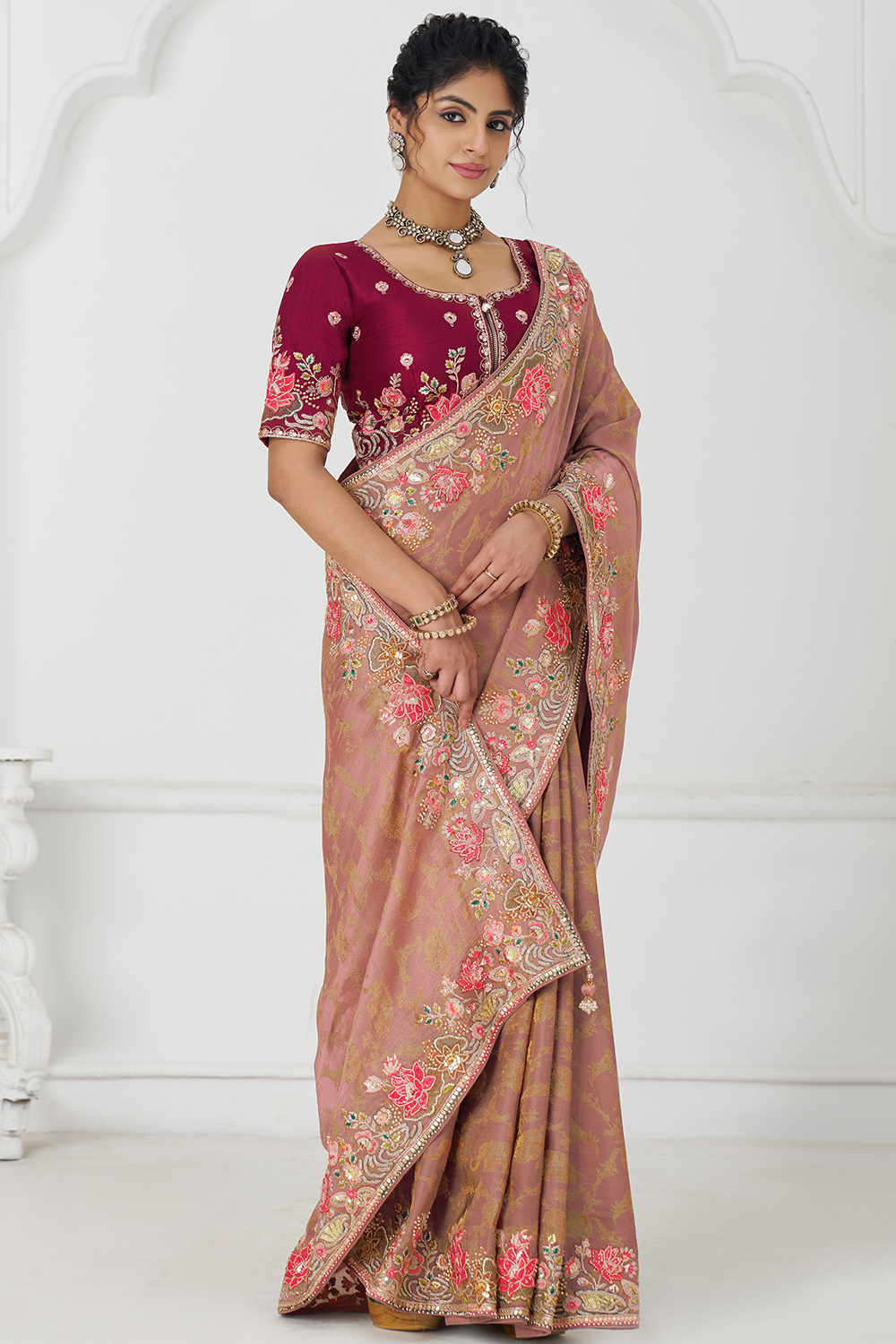 Silk Blend Embroidered Dusty Mauve Wedding Wear Saree
