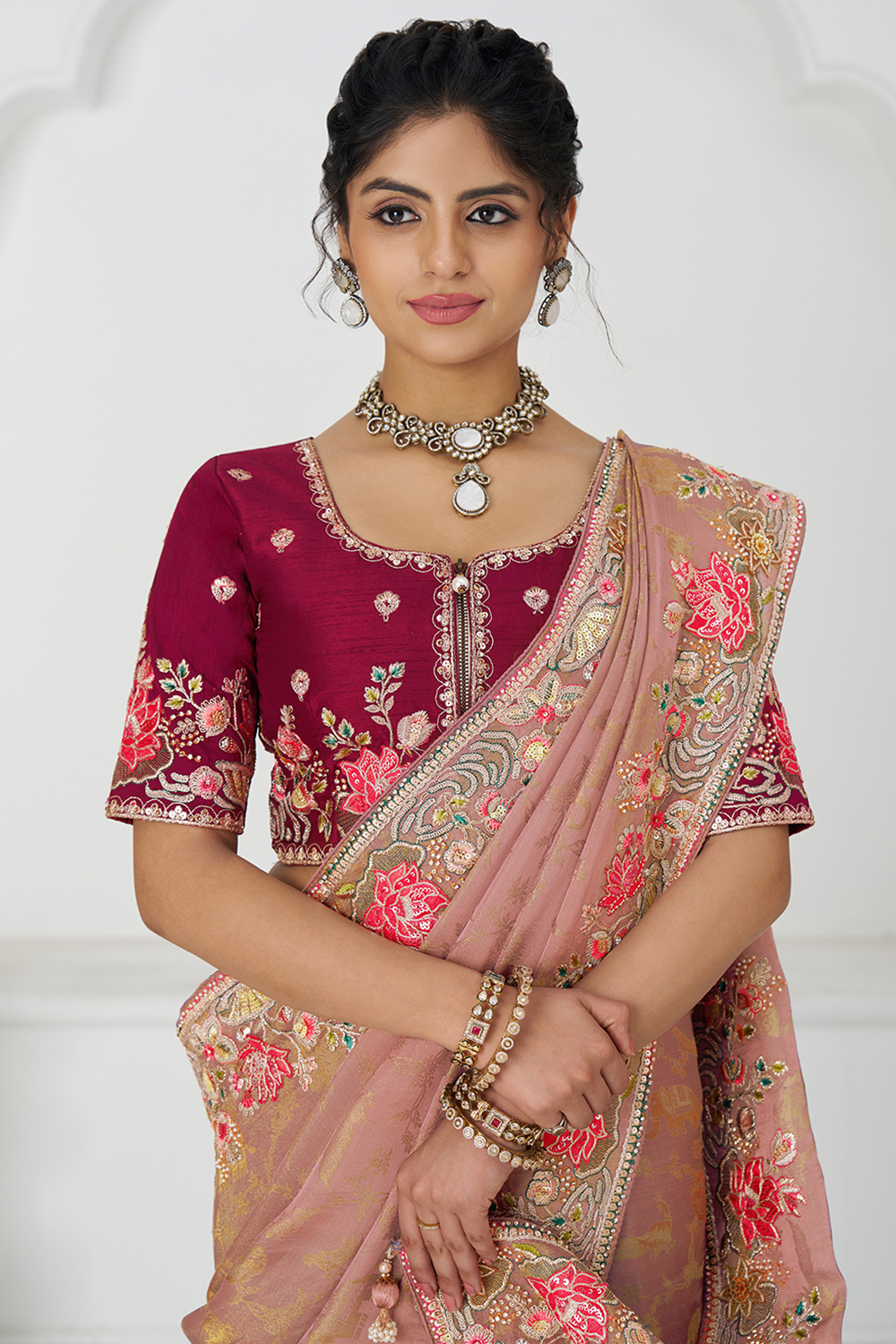 It is paired with a silk blend fancy saree in dusty mauve color adorned with zari, dori, sequins, stone, resham thread, weaved thread, and pearl work.