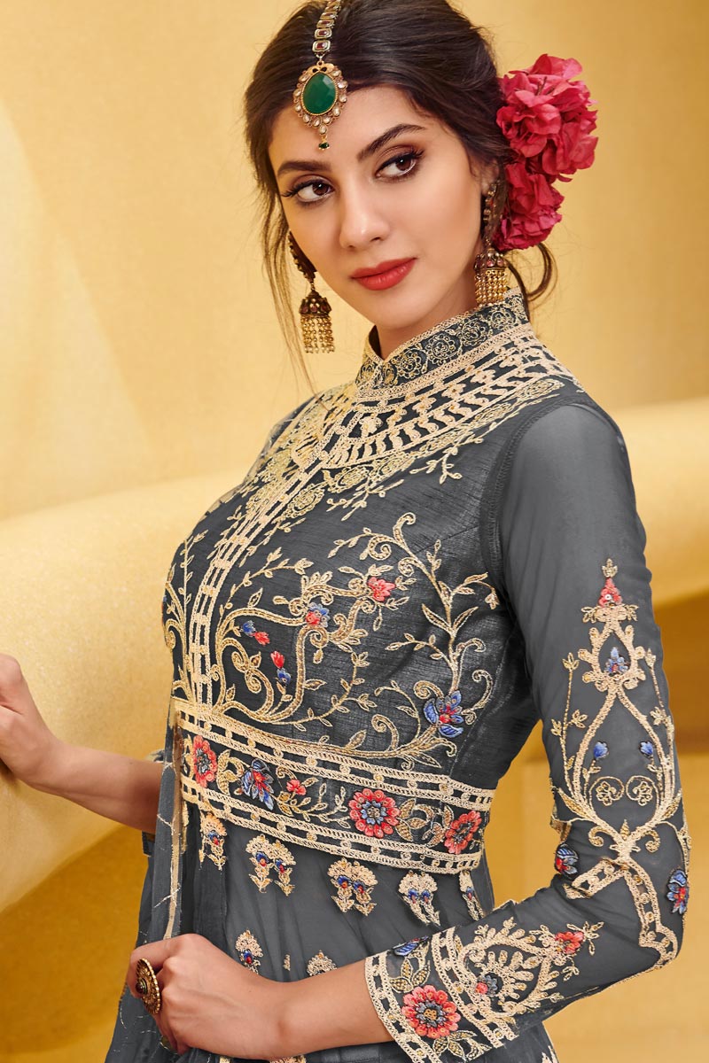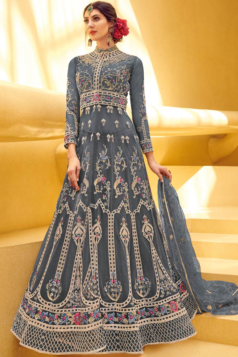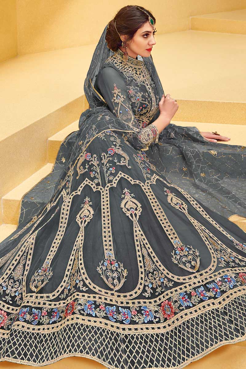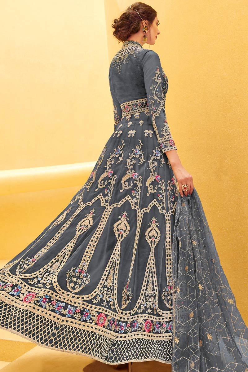Steel Grey Net Embroidered Indian Anarkali Suit