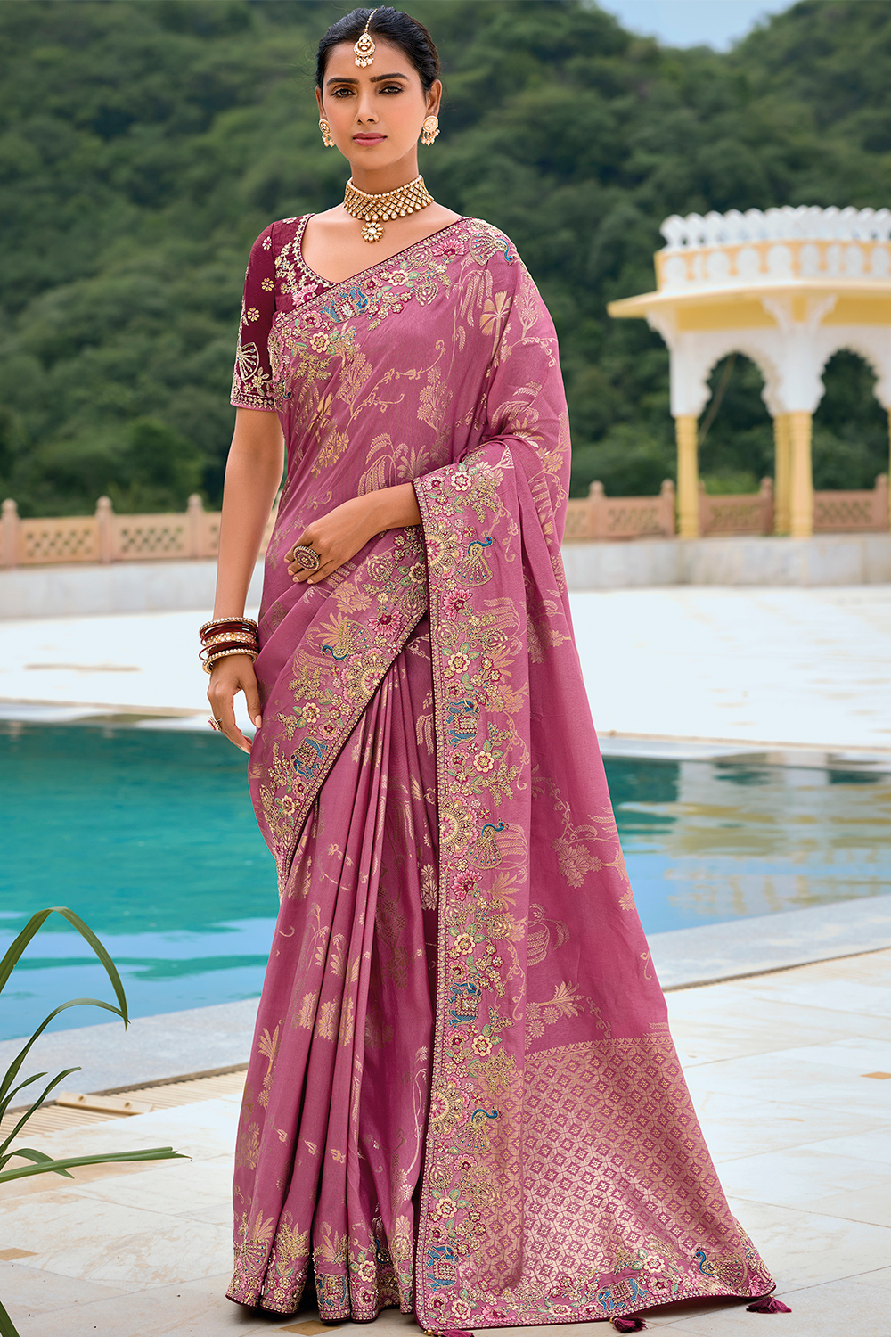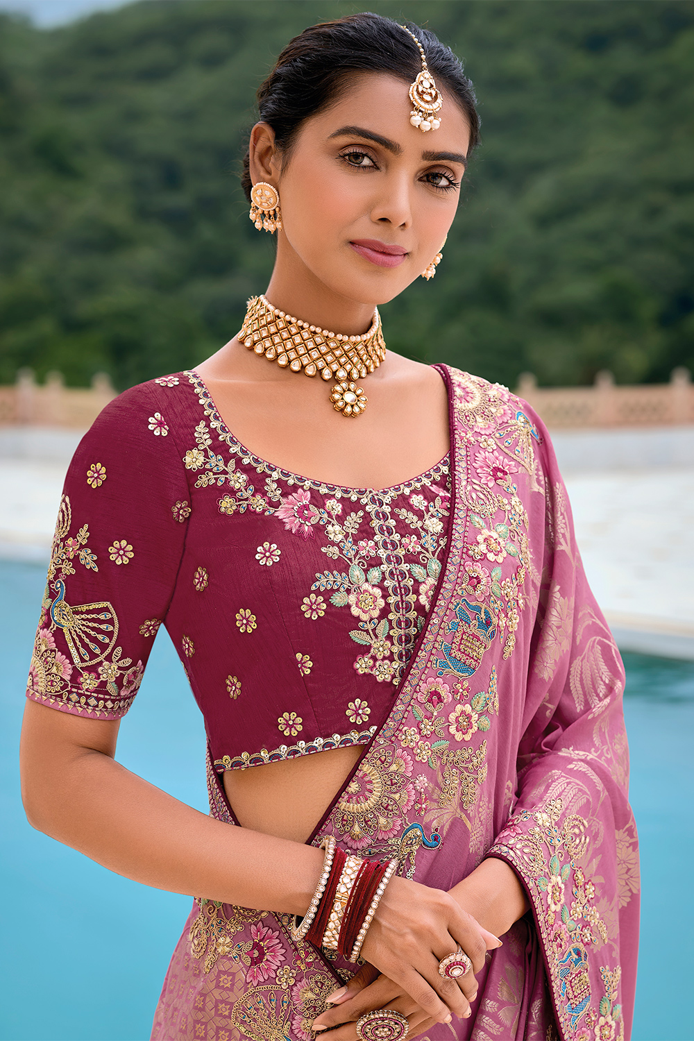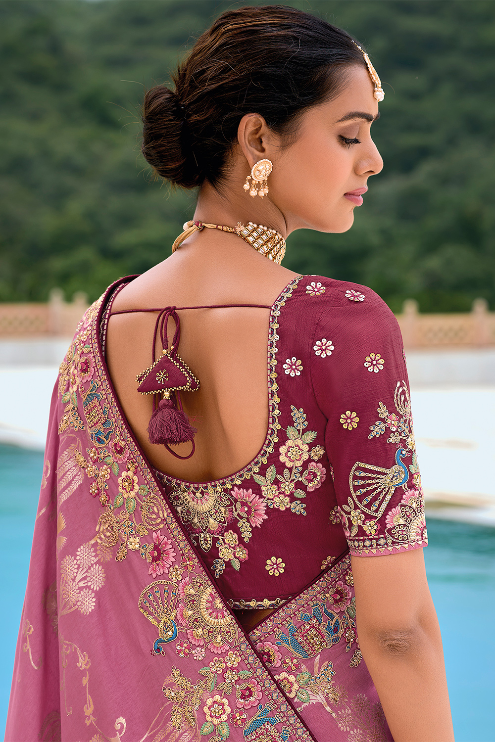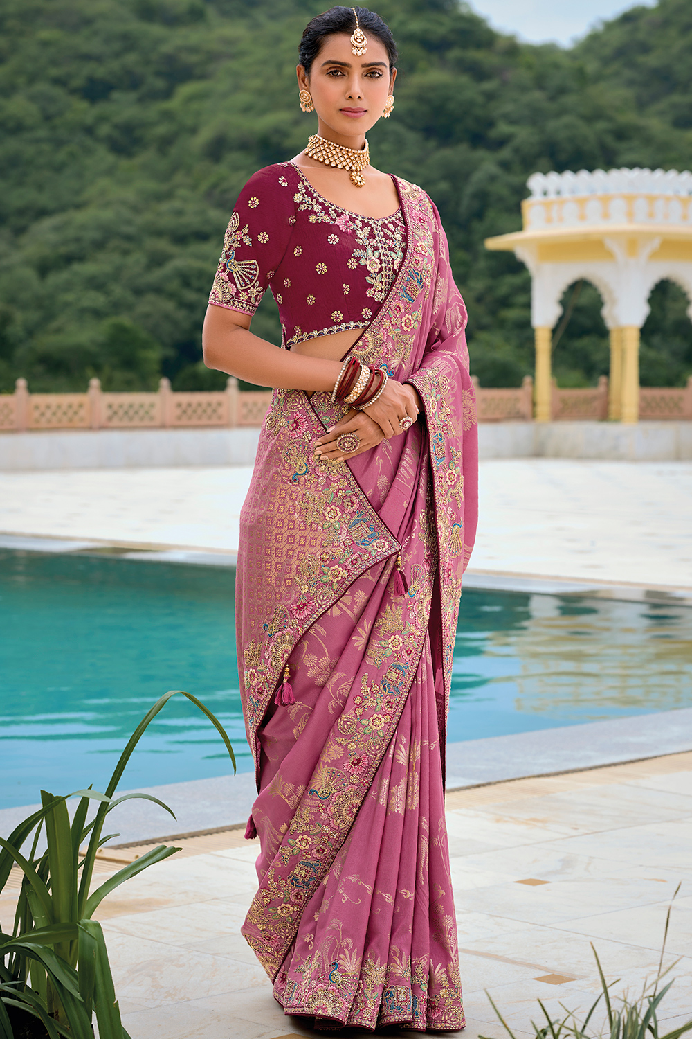 - Saree - Taffy Pink, Blouse - Burgundy Maroon
