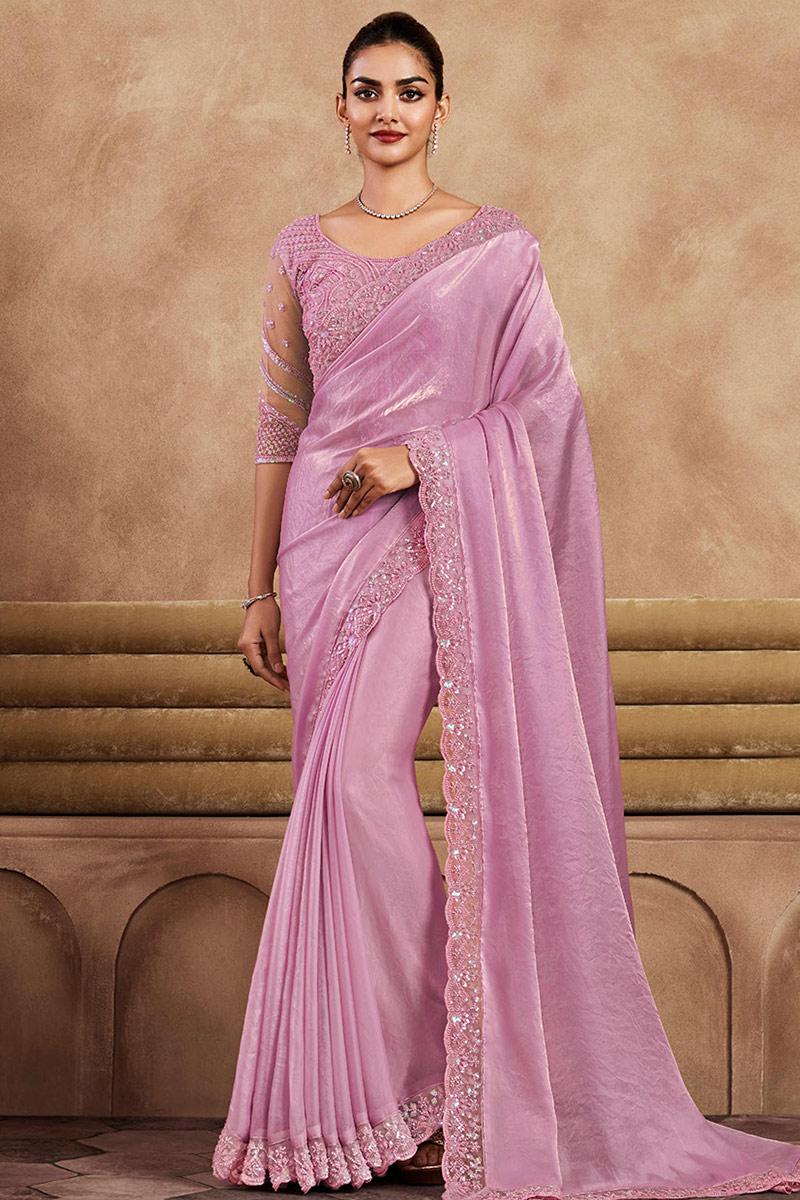 Thulian Pink Organza Silk Shimmer Saree With Lace