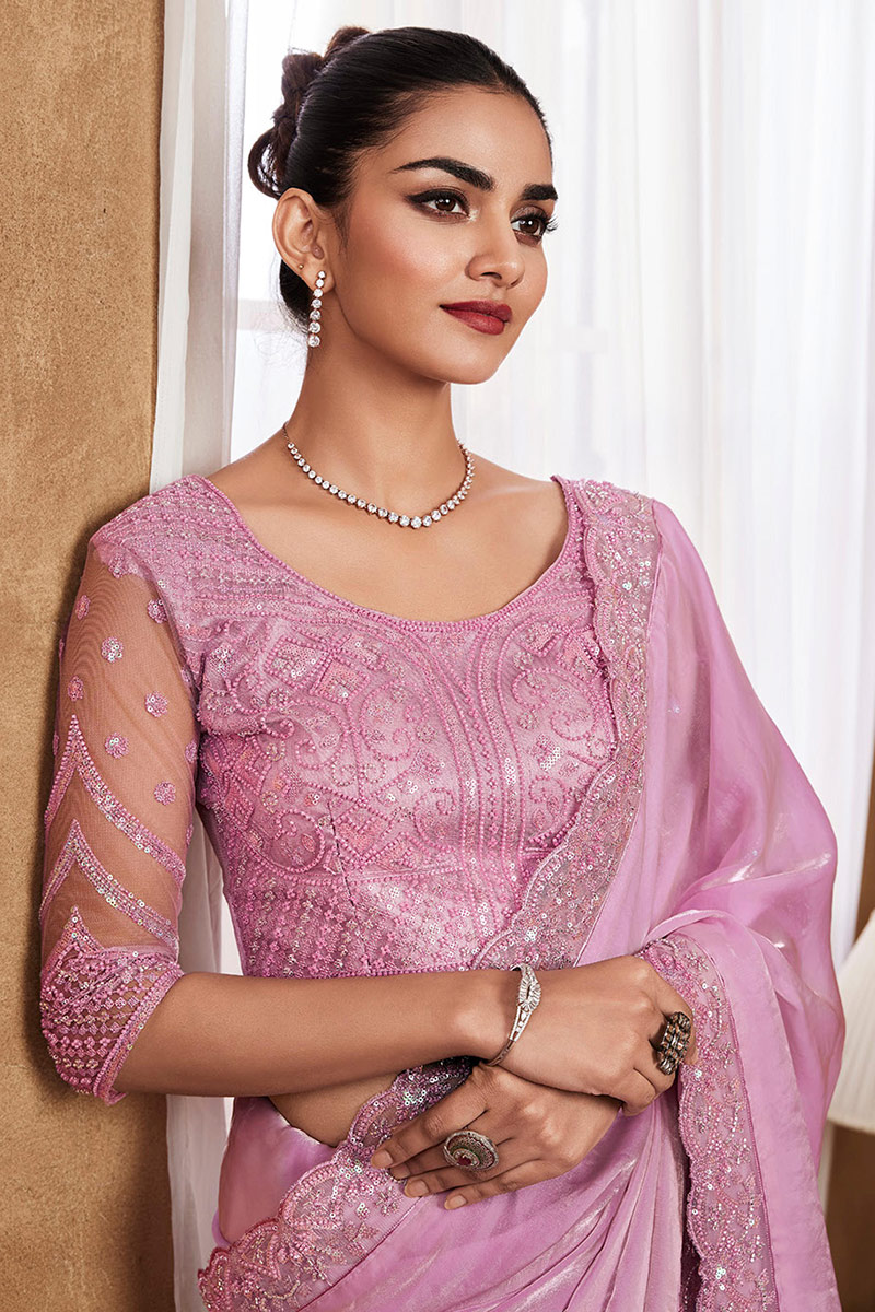 Look fabulous and beautiful by wearing this thulian pink organza silk saree which will surely grab everyone's attention.