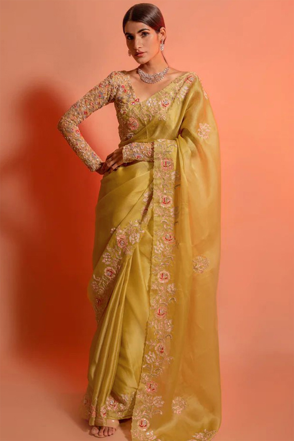 Pull together a chic look when you wear this turmeric yellow organza saree, which features beautiful embroidery work.