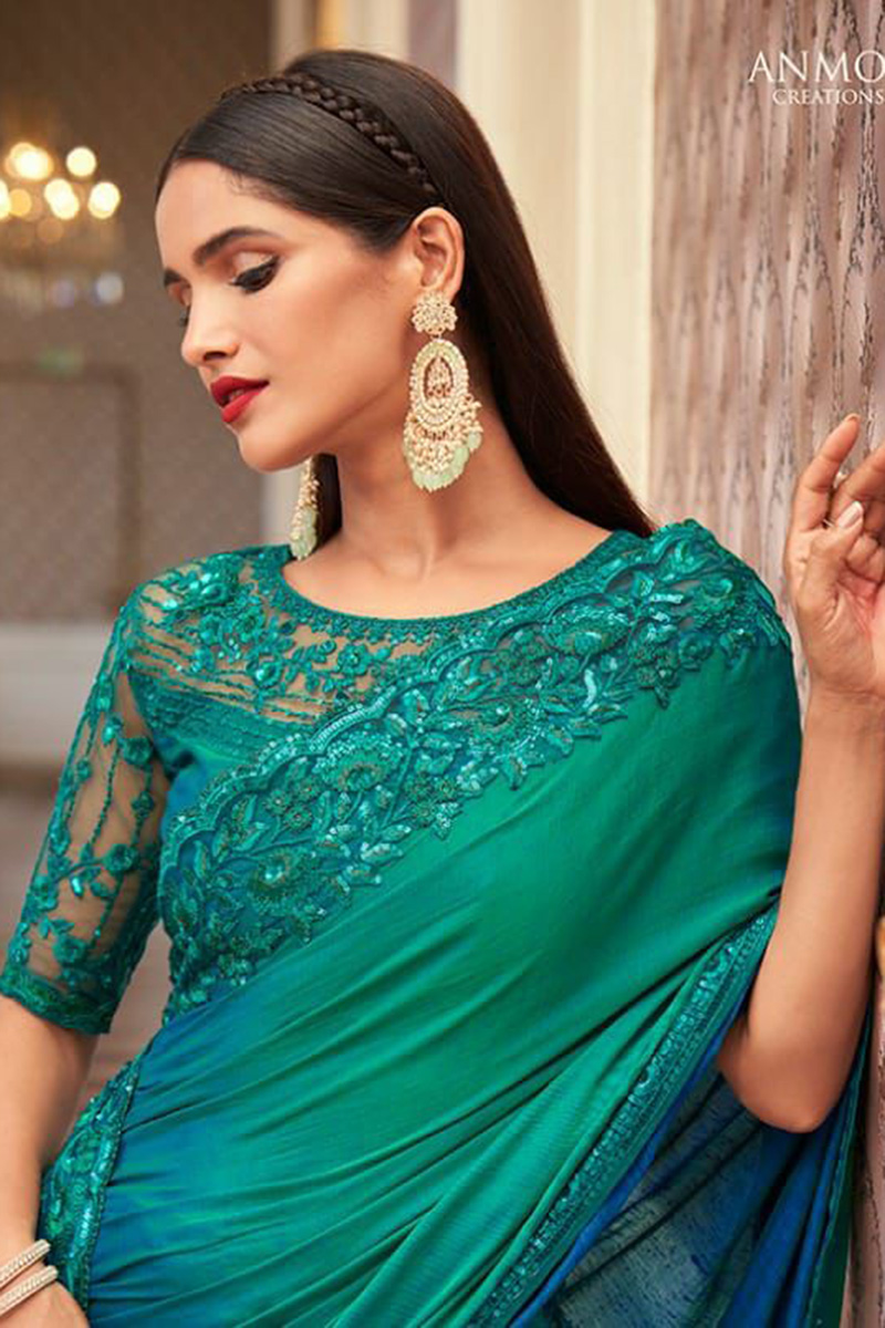 It is present with a silk embroidered saree in peacock green color decorated with patch work.