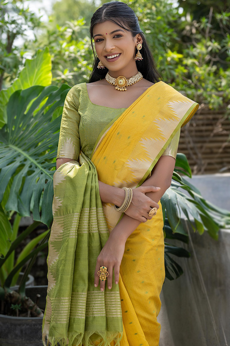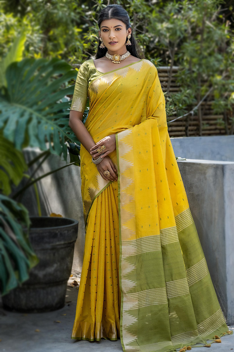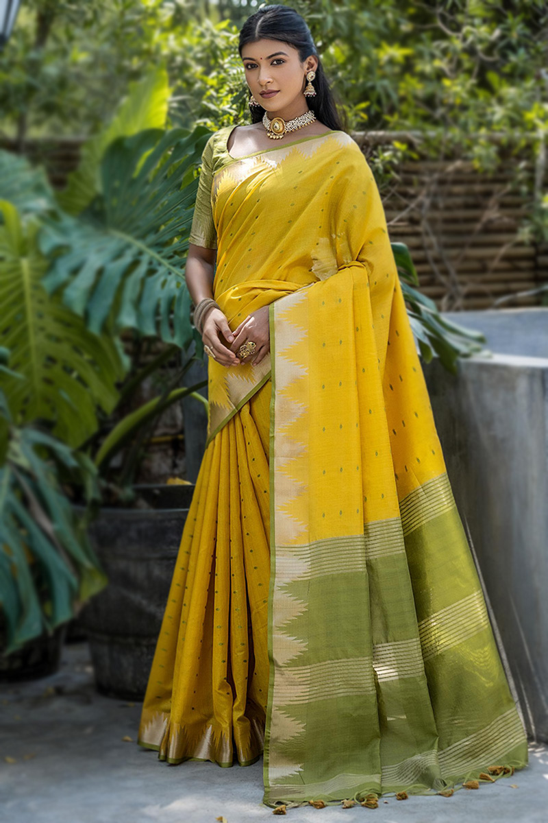 It is along with tussar silk lightweight saree in mustard yellow color weaved with thread and zari work.