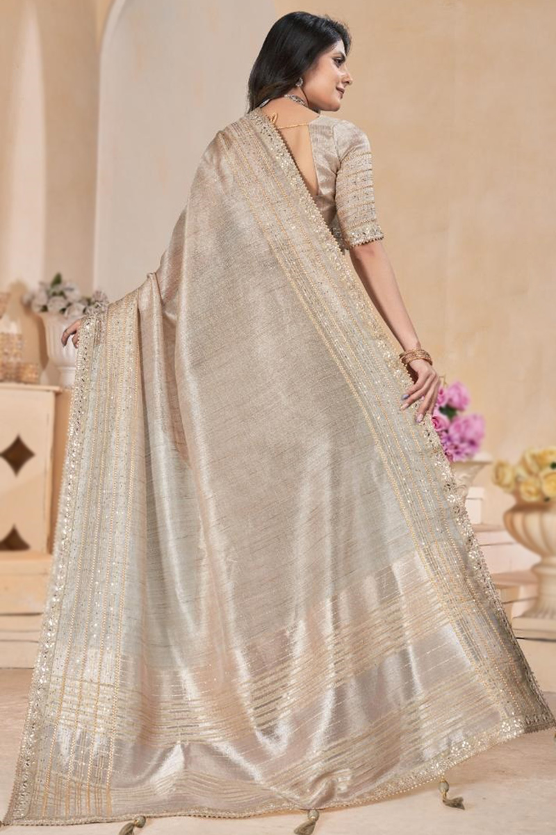 It is matched with a silk lightweight saree in grey beige color adorned with a zari, sequins, and woven zari work.
